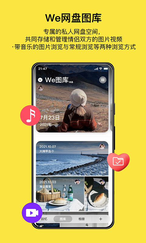 【情侣云相册】WE图库网盘-情侣云相册,双方共享一个云网盘相册。相片都分类放好,聊天里照片都保存下来,自动生成音乐视频相册。