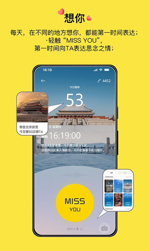 【想TA】想念计数功能只要想TA,点一下告诉TA ,把我想TA的所有时刻和在哪次数全记录下来,拍个照片做成永恒定格海报。