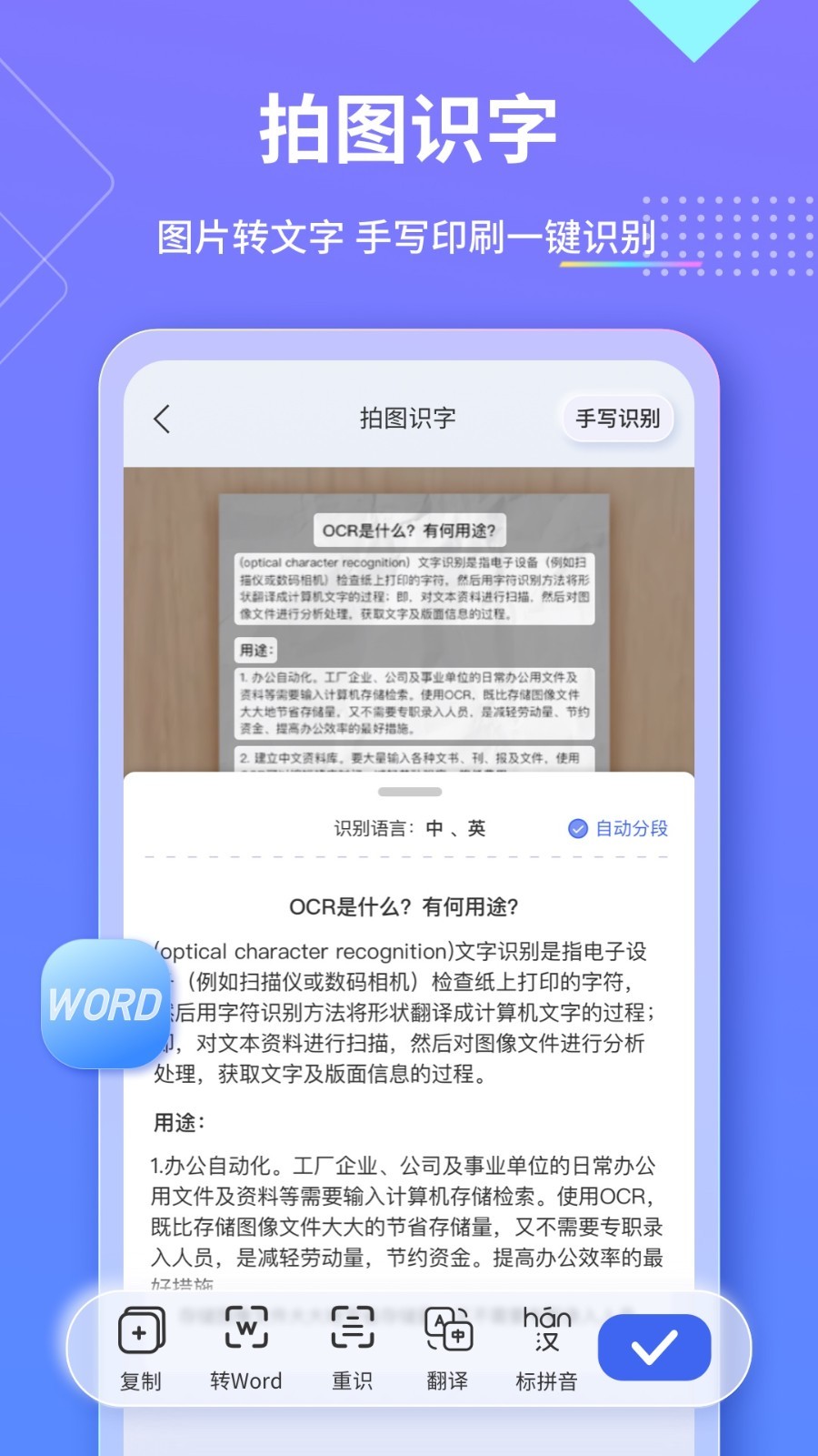 识别并提取图像中的文字信息,快准高效,一键复制导出,快速整理资料;