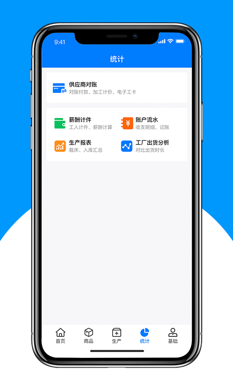 客户应收、供应商应付、固定资产管理、账户余额管理,财务报表等:5、小程序:系统对接微信小程序,数据秒级同步,订单信息实时通知:6、报表统计:生产进度报表工厂出货统计报表等【功能亮点】1、软件简洁易用好上手,同时兼顾中小微工厂多祥需求,一站搞定工厂管理得必须功能,真正懂中小微工厂的软件;2、既省钱又提业绩:为工厂降低管理成本省钱,提供多样化营销工具工厂提业绩:3、提升工厂执行力:分享产品做销售,分享销售单收款,分享采购单让供应商发货,分享对账单来核对应应收付款:4、能管生产的软件:生产管理全流程覆盖,让管理不留死角:5、全流程信息互通:档口、销售、采购系统同步,快捷同步商品资料、入库档口;6、不同角色不同权限:多员工、多角色、多门店同步使用,所有人按业务流程紧密协作,销售员开单,跟单员采购返货,财务收款,经理老板看报表:7、扫码就能盘库:扫一扫随手完成盘点、采购和销售,秒级操作,效率提升数倍。