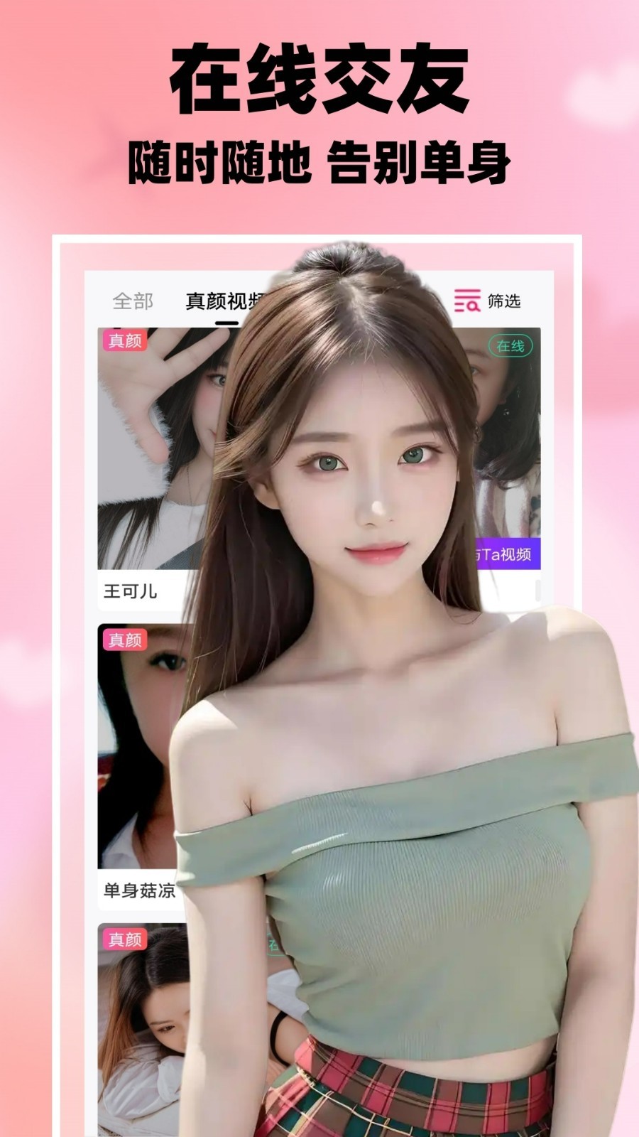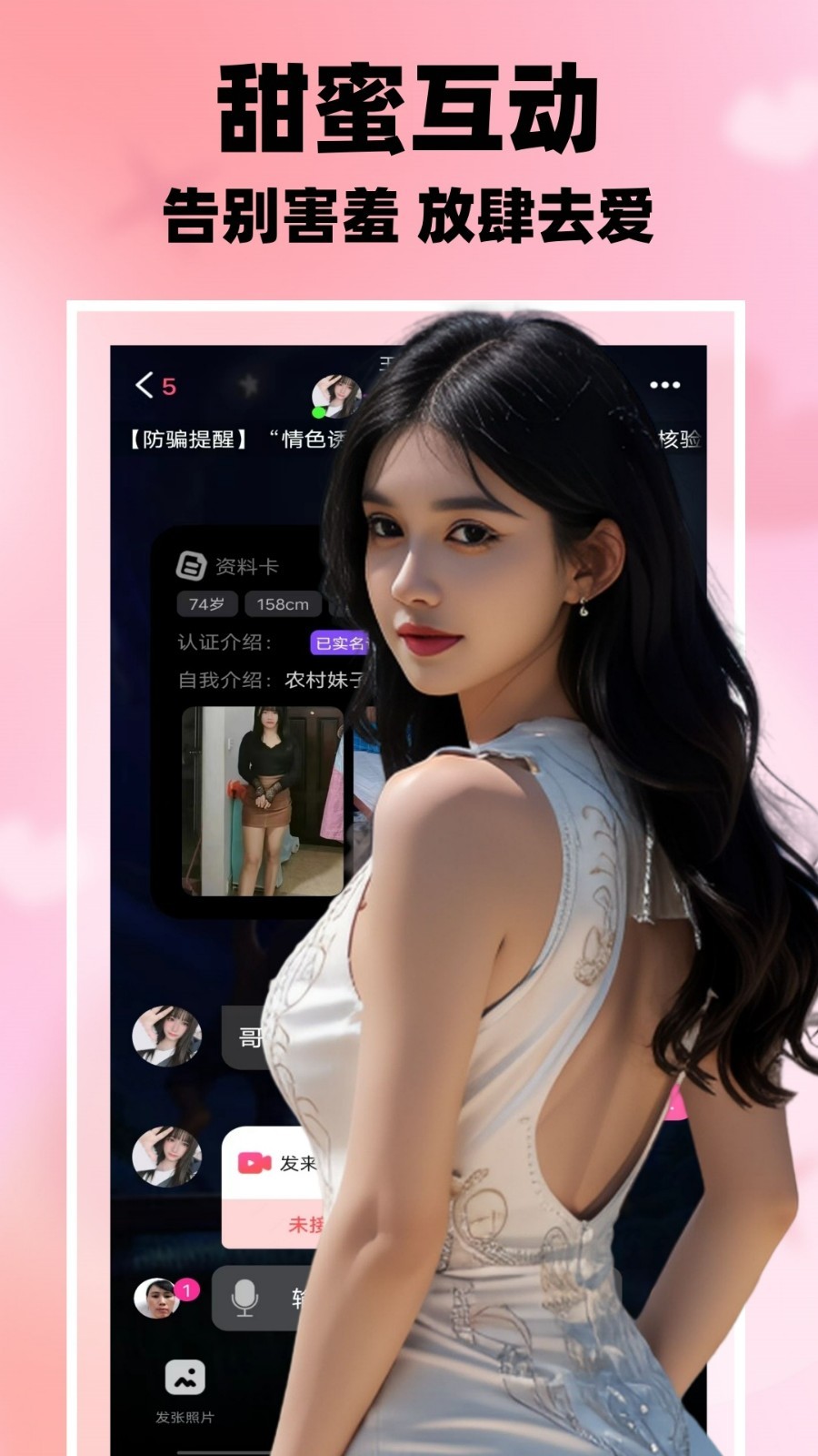 一个真实高效的脱单,多数单身男女的共同选择!你可以通过文字、语音、视频等多种方式与同城附近异性聊天互动。查看对方资料及动态,快速一键聊天,无需加好友直接聊天,线上聊天互动,线下见面互相了解。沉浸式的恋爱体验,破冰式真实零距离聊天交友。
