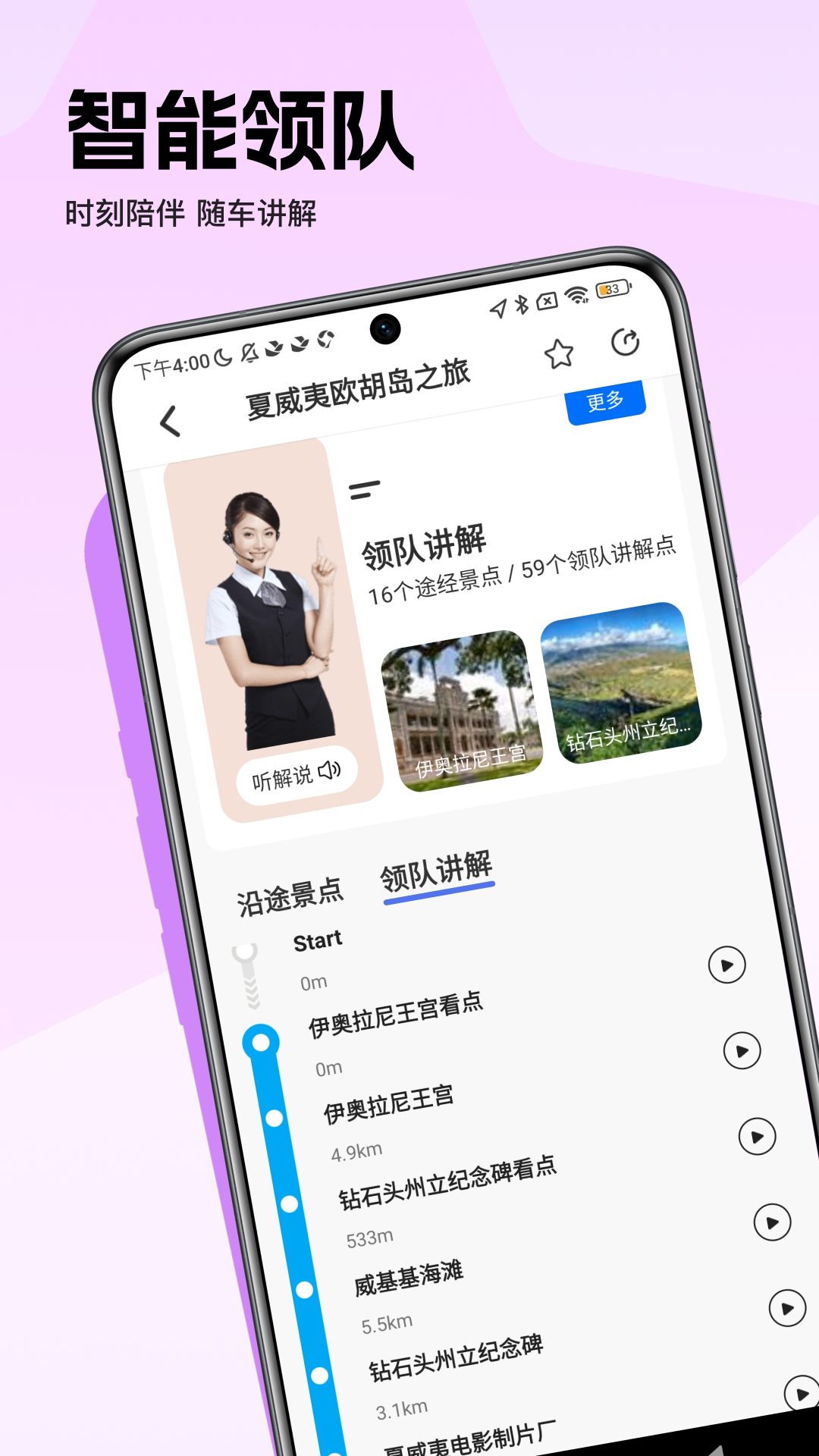而且无论你在哪里开车,时刻陪伴全程讲解,它会随着你车辆位置的变化根据你看到的景色和场景,人文历史住宿美食,专业的讲解贯穿行程。让你的自驾旅行更简单,更有趣!