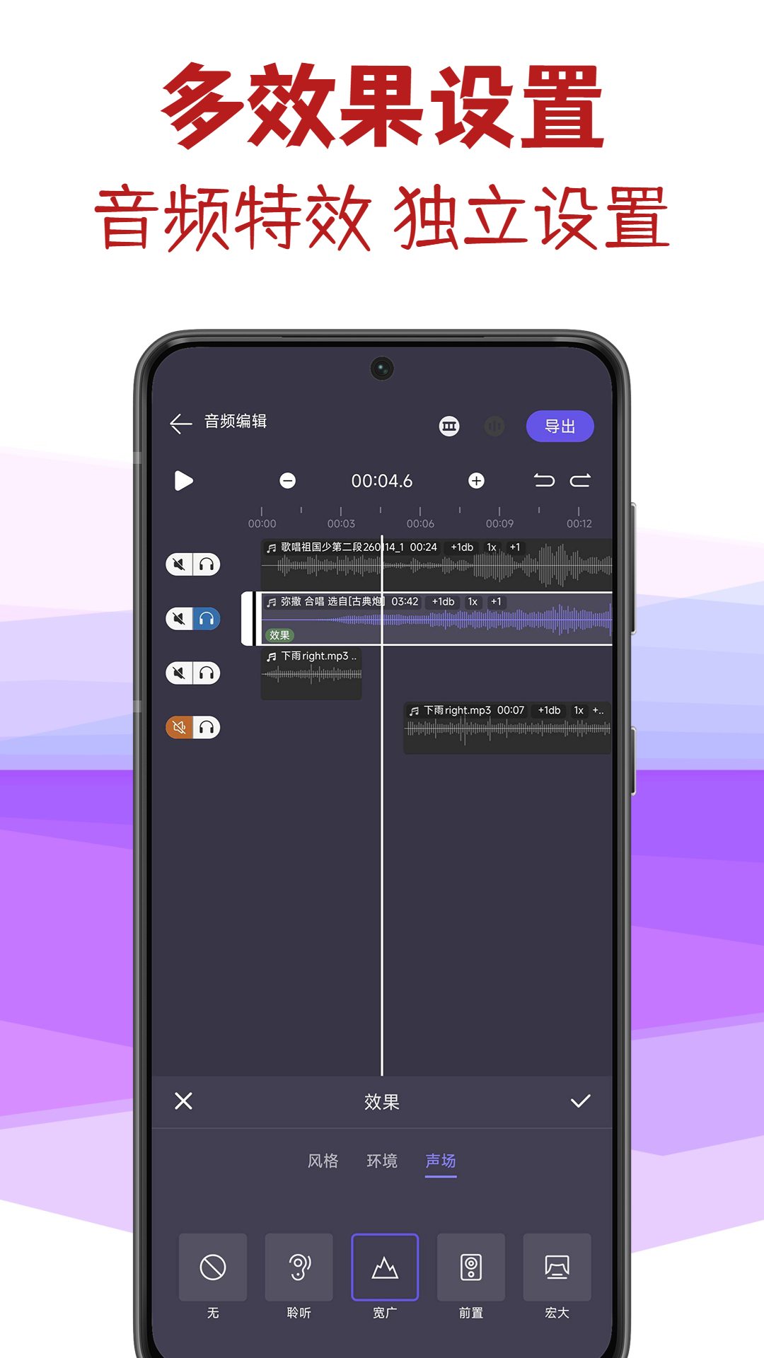 软件的「超级音频剪辑」功能,支持对多个音频文件同时混剪操作,删减、合并、分割,能够单独对其中一个音频设置伴奏、淡入淡出、人声分离、变声、音量、音调音速、环境音效等。