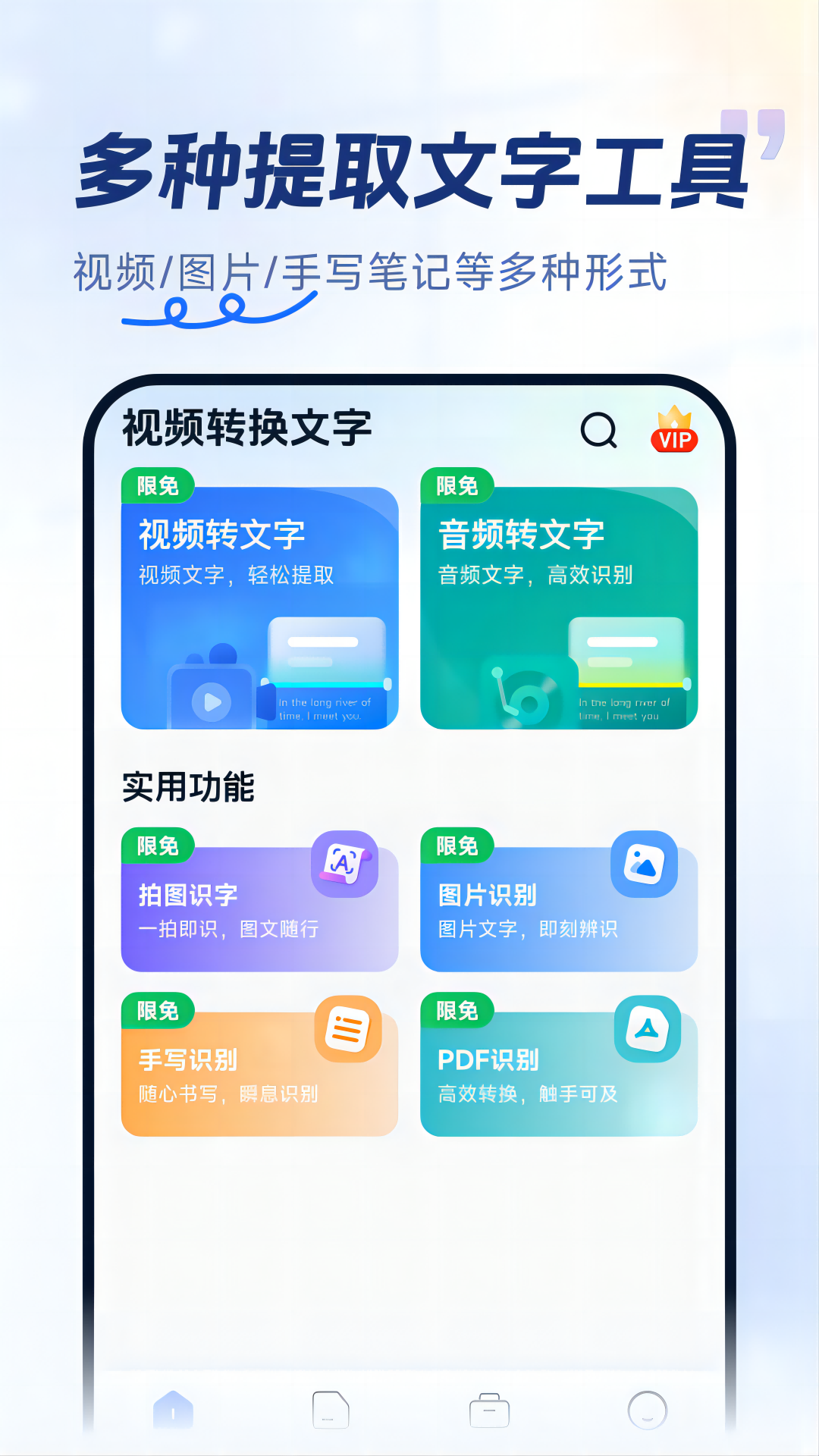如视频转文字、音频转文字、手写识别、拍图取字、图片识别、表格识别、PDF识别等