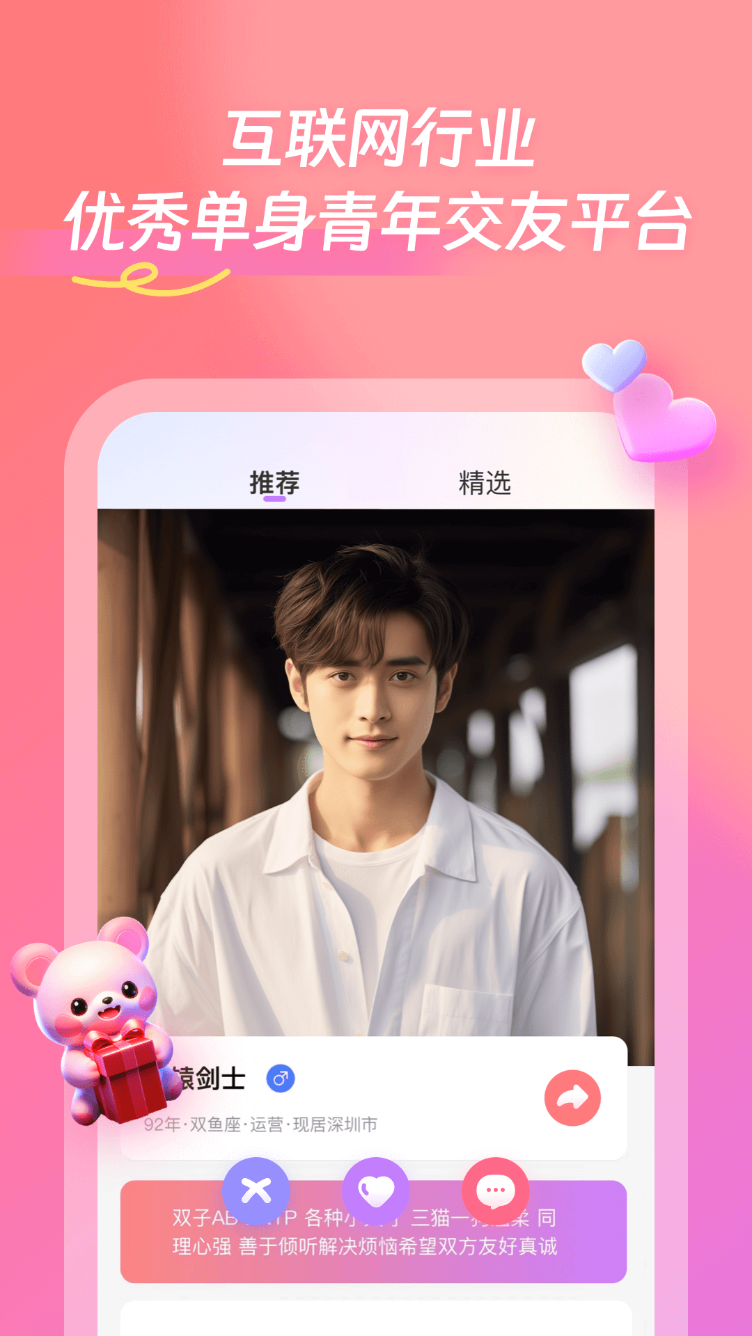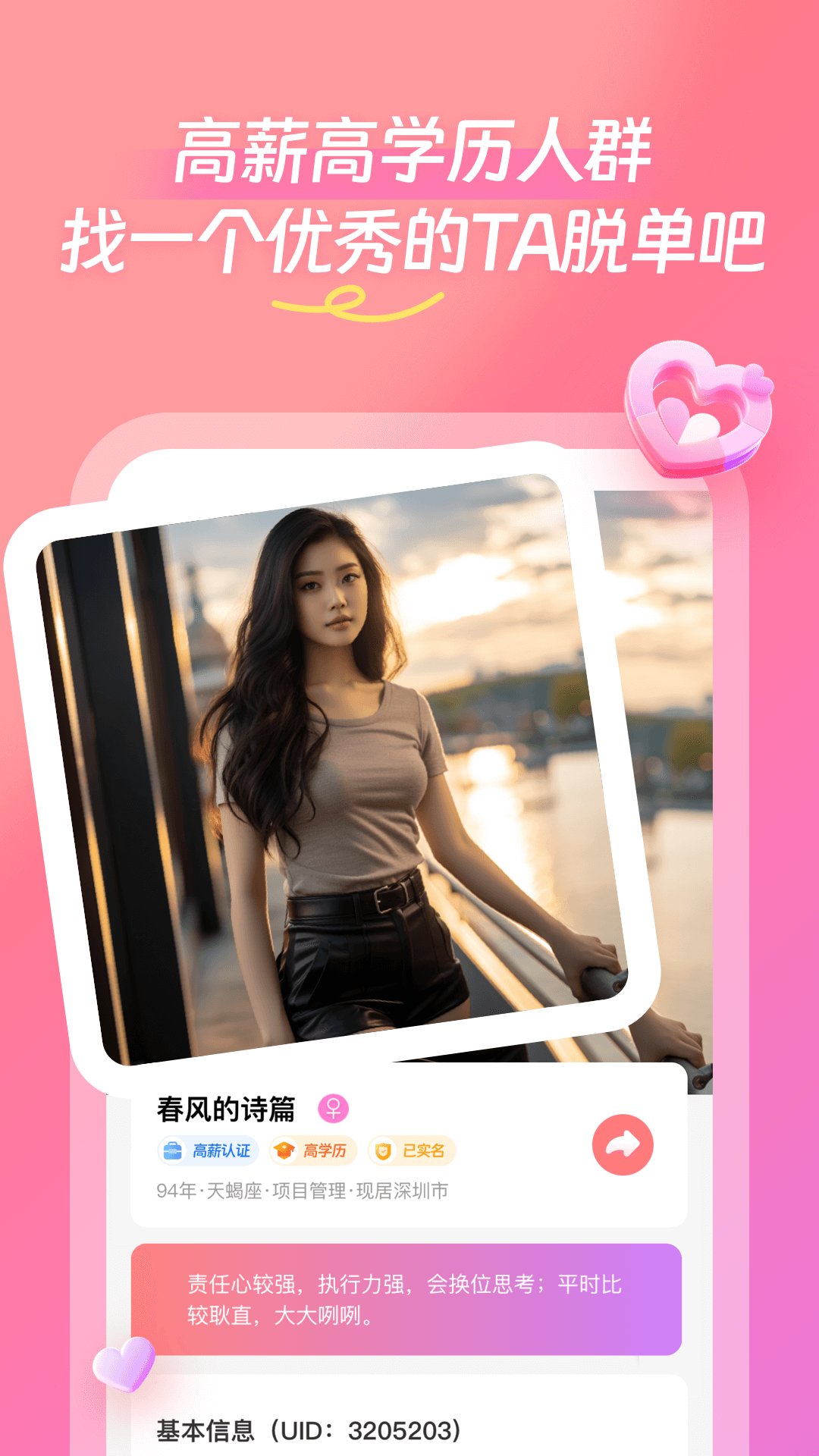 - 实名制交友:我们认同并实践实名制交友,已开放高薪高学历认证,为你匹配高质量同频用户。