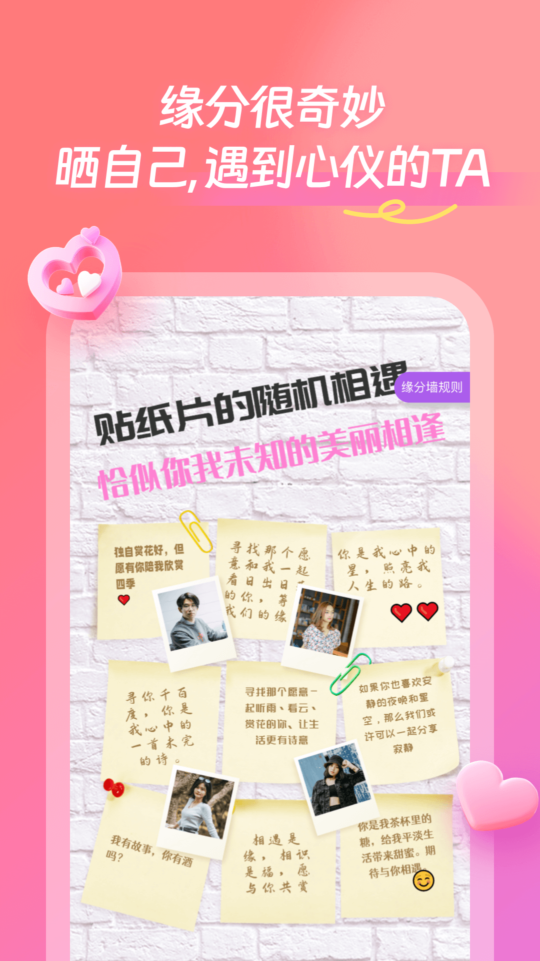 - 缘分墙:类似漂流瓶树洞,抽张缘分纸条,也许你就邂逅了人生的另一半,快来抽个对象吧。