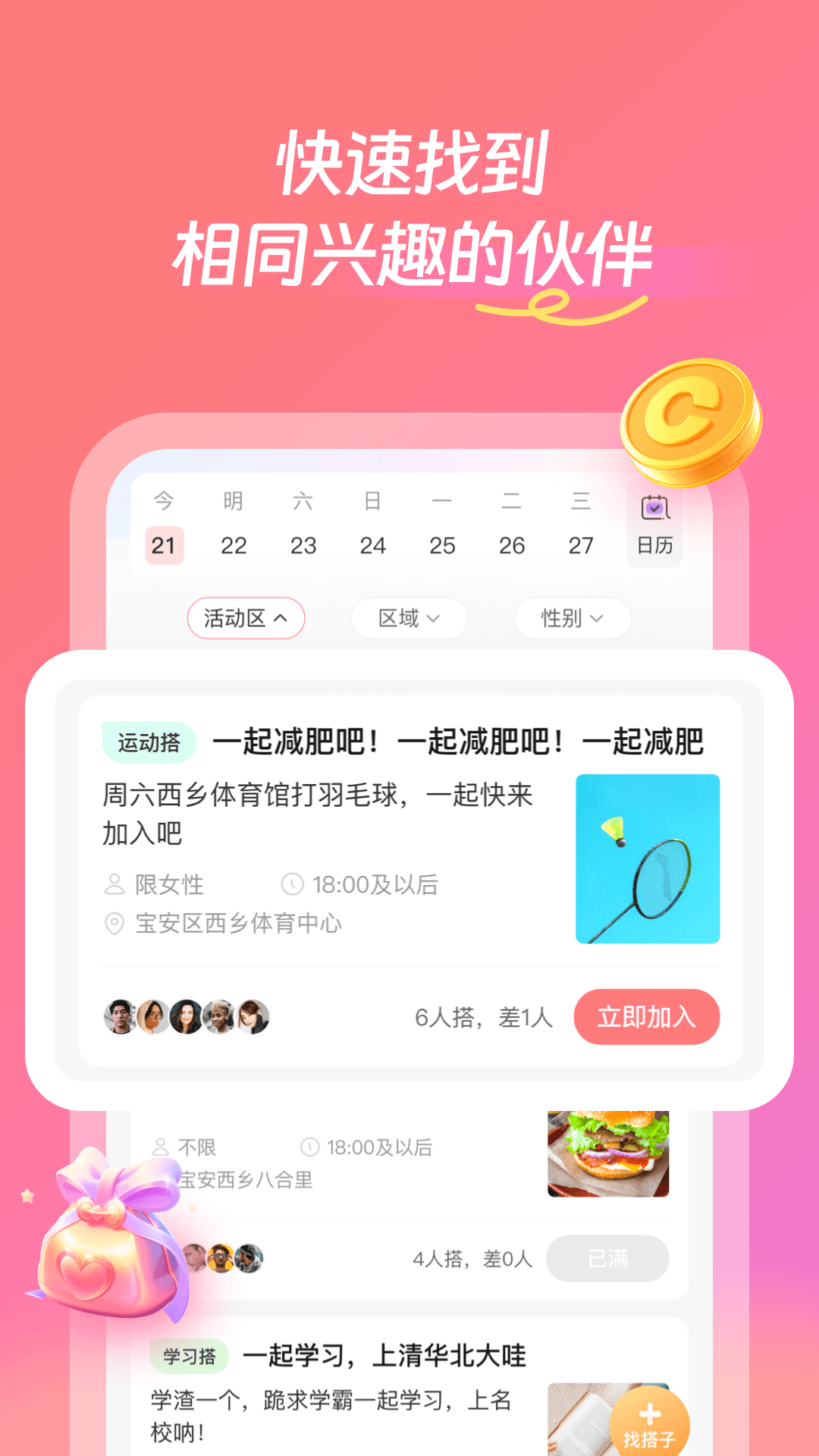 - 找搭子:台球搭子,饭搭子,学习搭子,旅游搭子,恋爱搭子,游戏搭子,学习搭子,运动搭子,娱乐搭子,生活搭子,户外搭子。