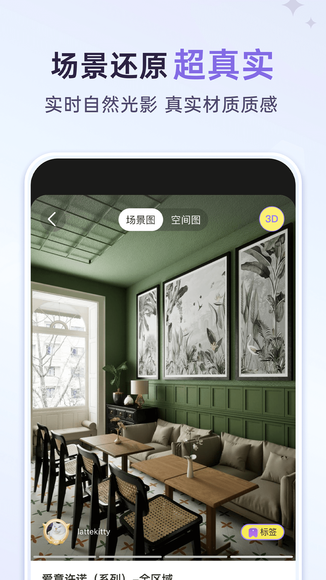 应用详情:大家好,来绘APP是一个超写实的、支持3D空间DIY创作和交流的美学社区。在来绘的世界,你不仅可以参与设计我们生活中常见的客厅、书房、卧室、电竞房等,你也可以参与设计全球各种环境、风格的室内、外空间,包括不限于海边别墅、潮流酒吧、街边咖啡店、法国古堡、英国花园等,通过更具趣味性的方式去学习、体验和理解生活中的美学。更棒的是,你还可以从社区其他人的作品汲取灵感,用到自己真实房子的软装过程中。