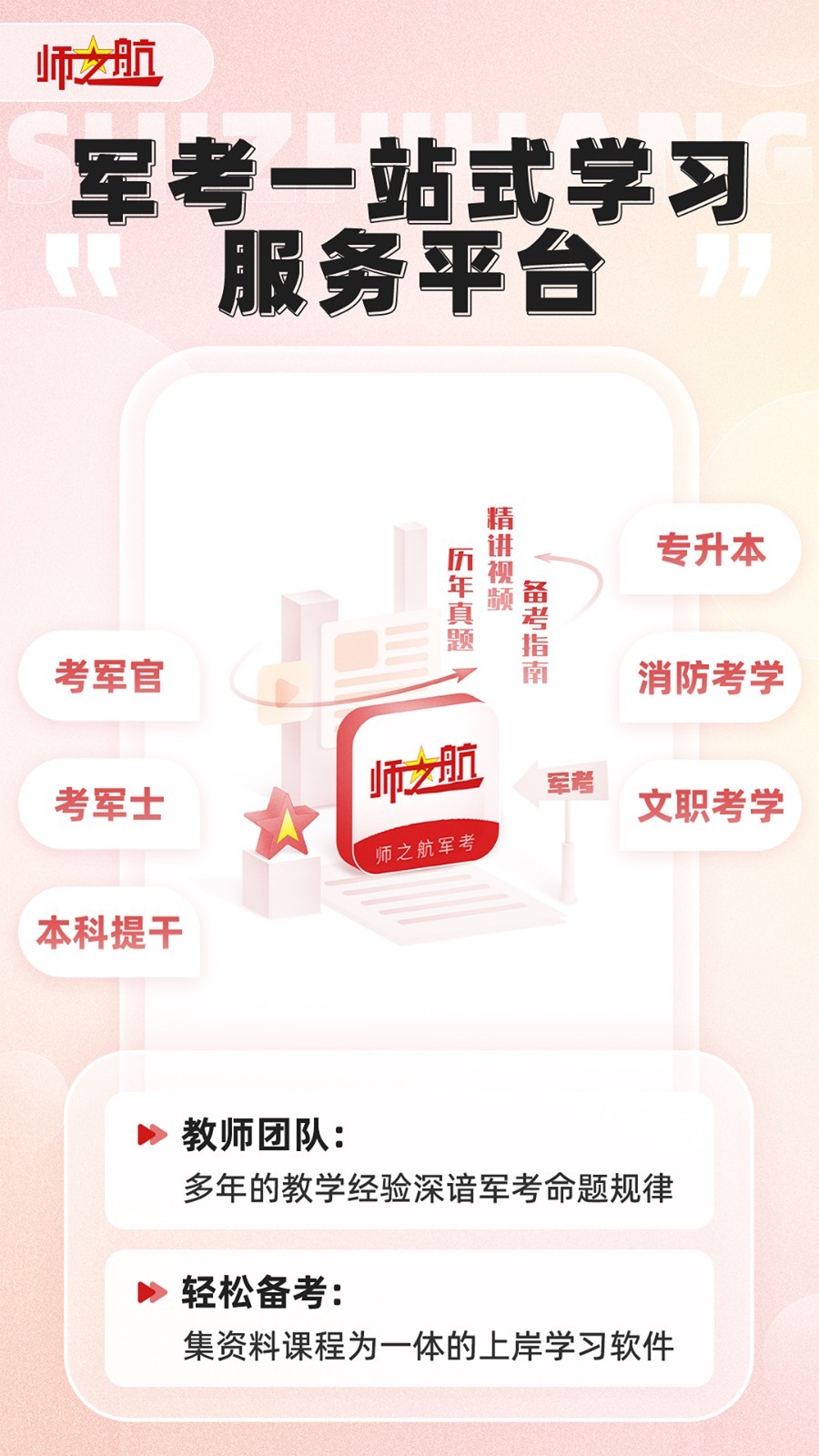 应用详情:师之航军考旗下APP,战友一站式学习软件,刷题、课程、资料、资讯全都有、为军考、士官单招、本科提干、消防考学、军队文职备考提供一站式备考服务。
