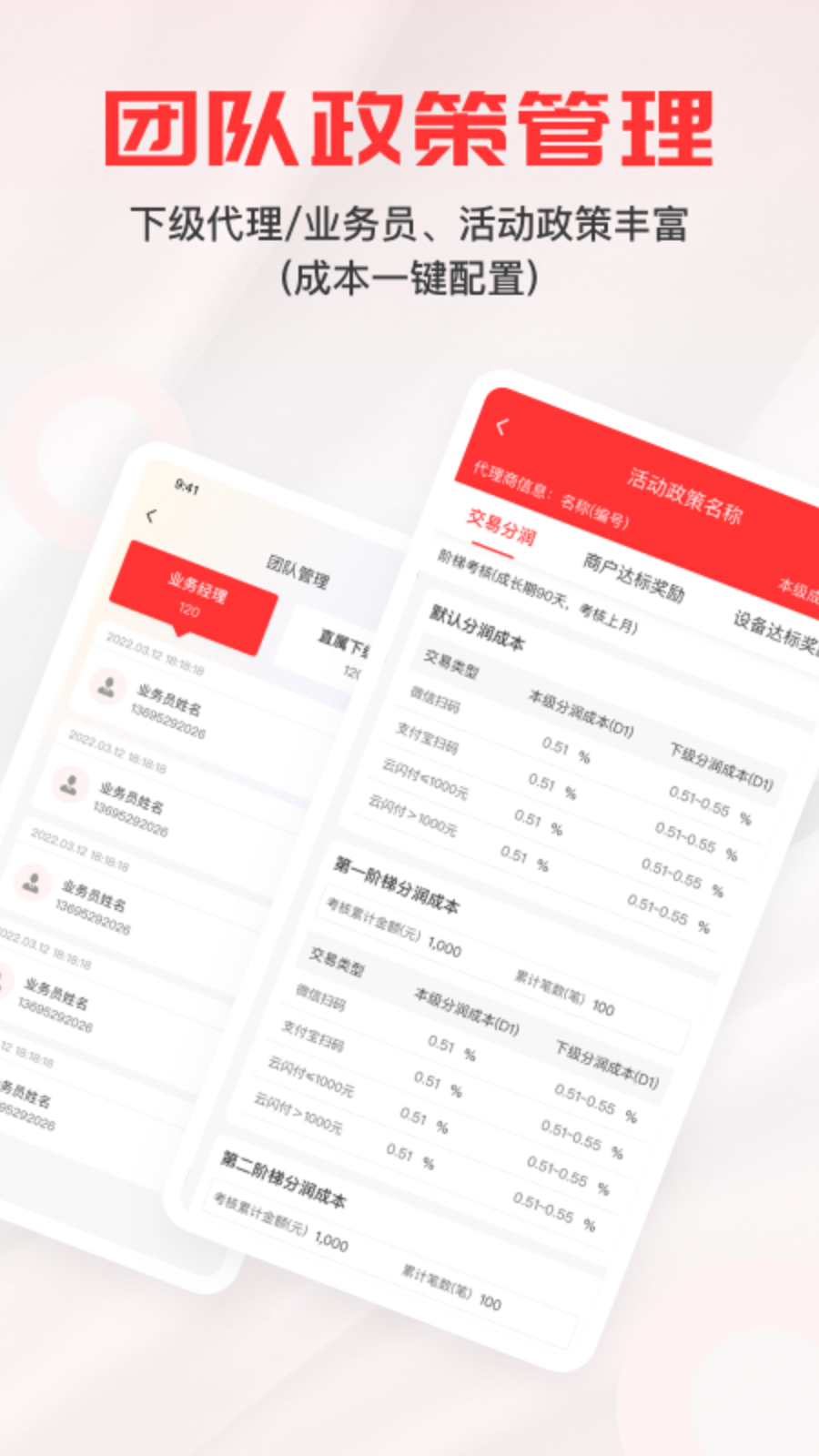 ●团队政策管理:支持下级代理/业务员展业、丰富的活动政策,满足多种场景和业务,支持成本一键配置;