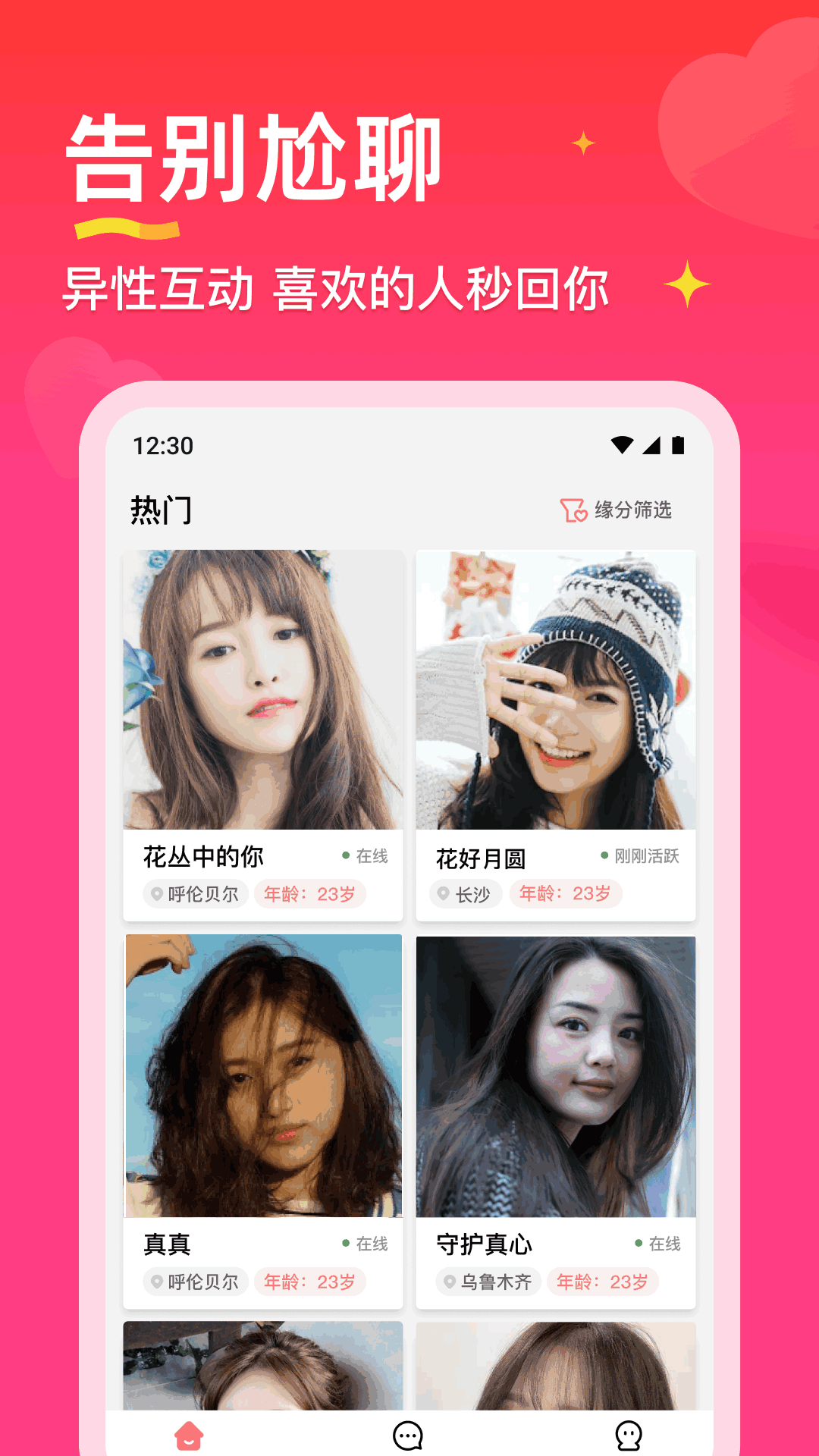应用详情:真心聊陌生交友视频聊愿相遇良缘是一款实时在线交友APP,用户的恋爱神器,用户都很活跃,喜欢找人聊天,在这里可以认识很多想脱单找对象的人,可能你的另一半就在这,需要脱单的朋友千万不要错过了哦。