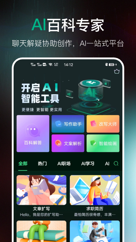 应用详情:AI百科专家是一款智能聊天对话、智能写作生成APP,你可以随时随地与它对话帮你解决各式各样的难题,如生活中的麻烦、学习上的难题、工作中的困扰等,给你提出解决方案。也可以协助创作,便捷高效地获取思路和灵感,输入自己感兴趣的关键词,它就能自动生成对应的各种各样的作文、诗歌、学习计划等。AI绘画输入自己想要的画面描述,它就能一键式生成色彩绝伦,画面精美的AI绘画图片。