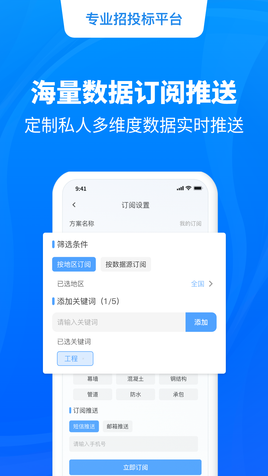 订阅:支持区域、城市、行业、关键词订阅,定制你关心的标讯,一键获取商机