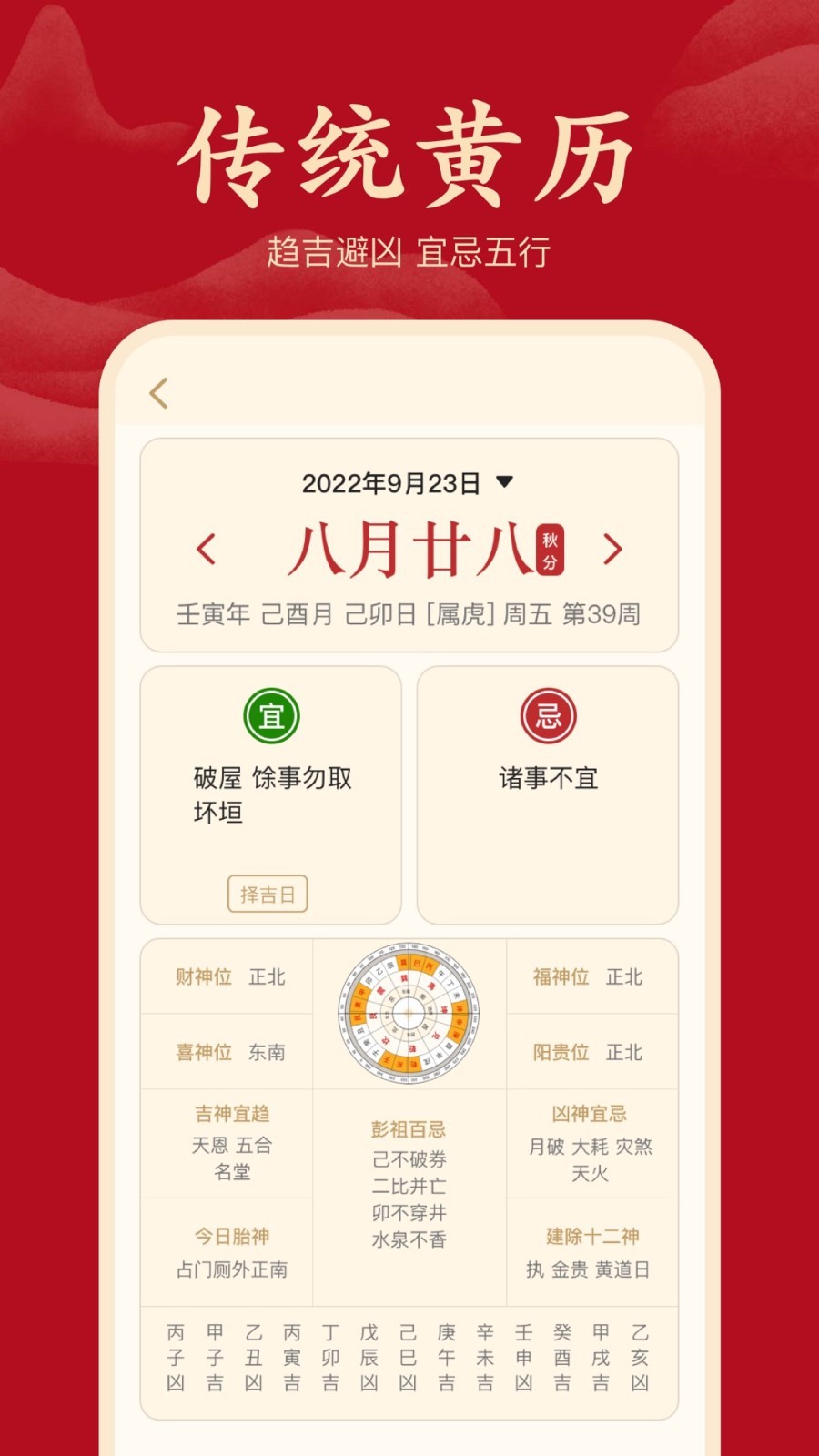 黄历宜忌、吉日查询、节日节气APP 看农历查宜忌知,是生活好帮手 【产品功能】 黄历宜忌、吉日查询,传统黄历通胜提示; 吉神罗盘,看清楚方向 阴历阳历、放假、节日节气