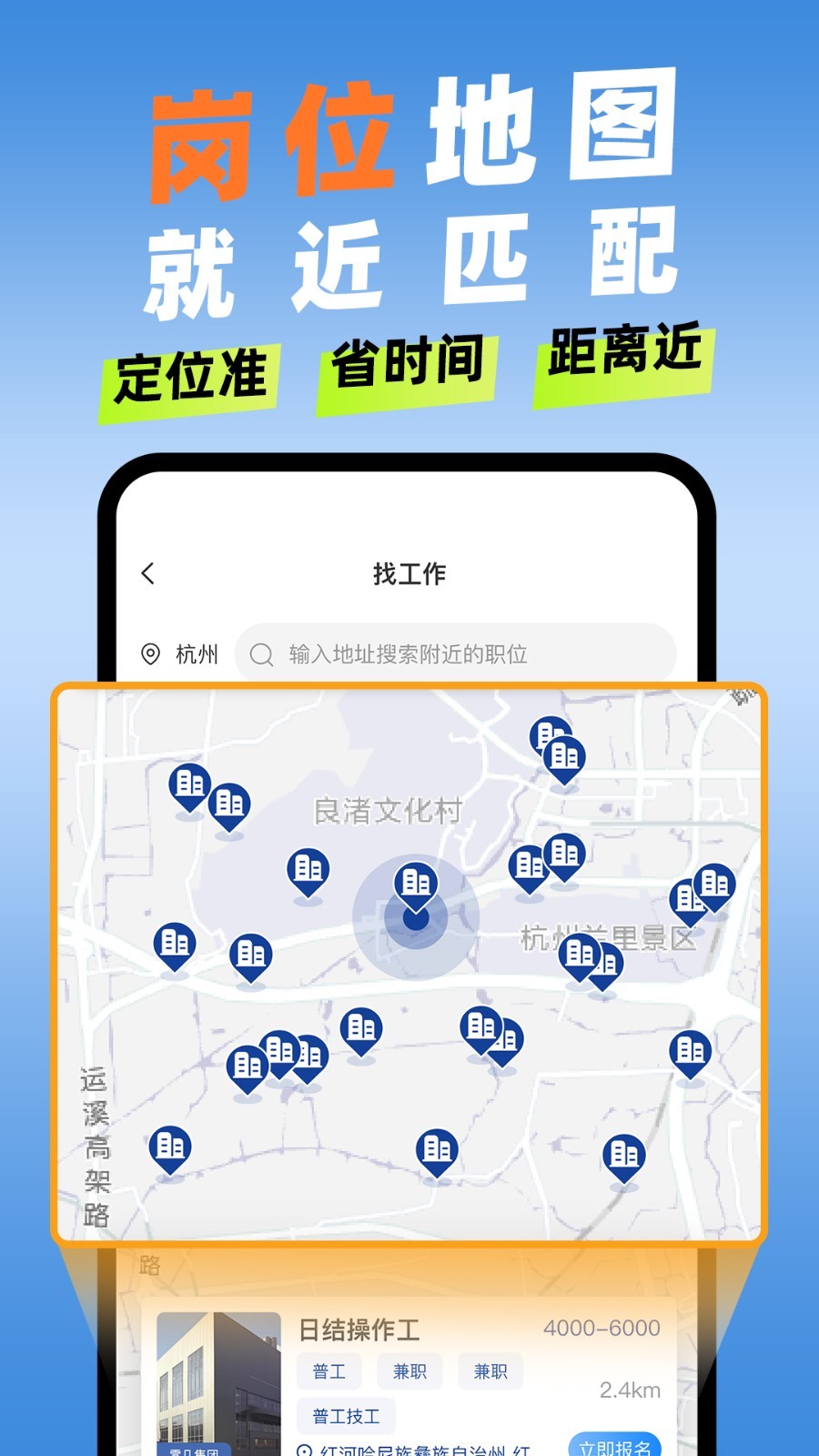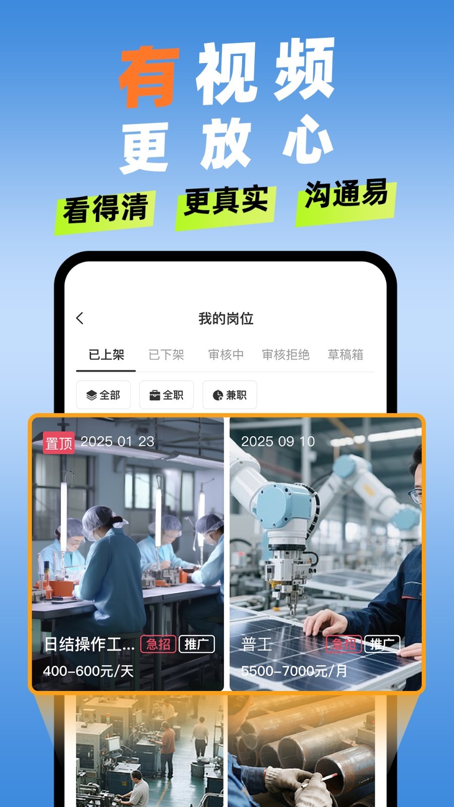 使用简单省心:智能推荐附近岗位,手机上查看工作环境视频。