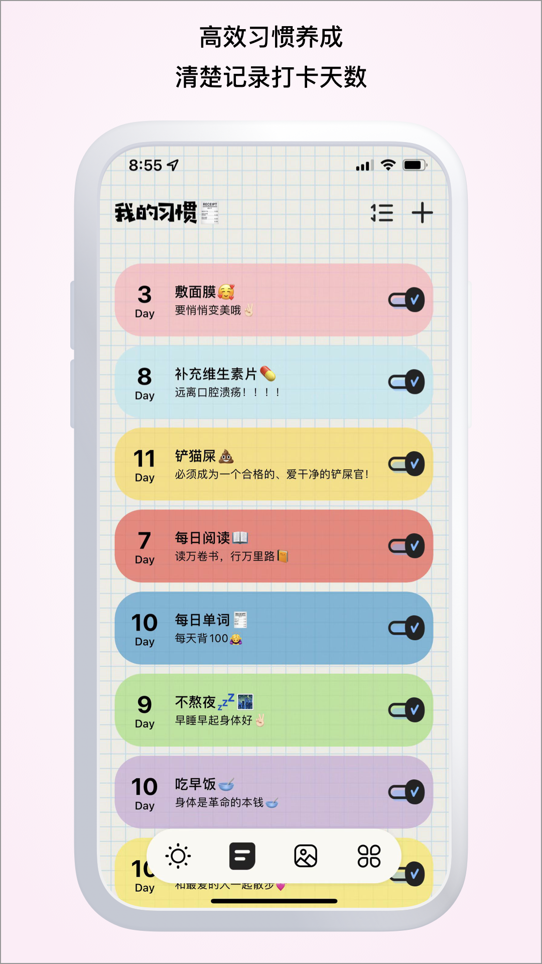 在这里打卡,变得非常简单,提前规划好每天的事项,您只需要右滑或者轻轻的按下习惯,ding的一声,您的打卡就完成了。
