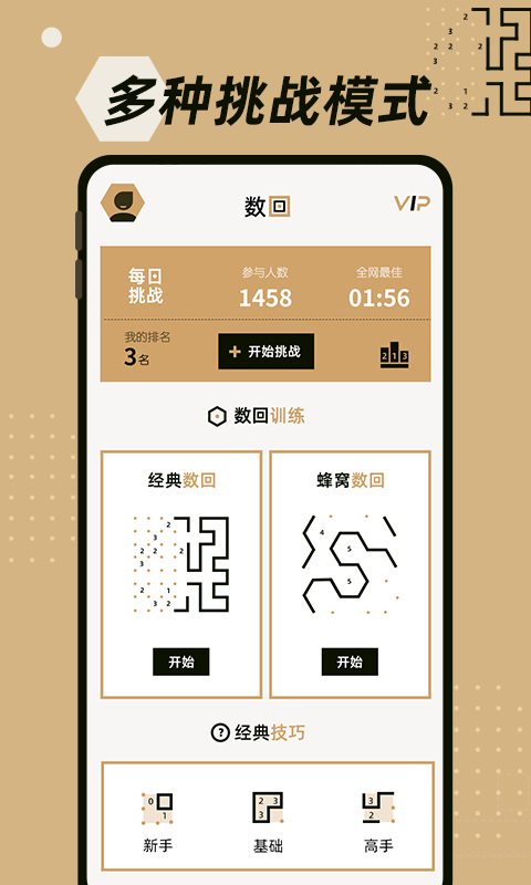 1.简介 -数回是一款锻炼数学智力的软件,通过数字与连线的结合训练用户的逻辑思维能力。在解题过程中,需要冷静推断,有系统地抽丝剥茧,提升数字敏感度和思维逻辑能力。 2.规则介绍 -数回谜题的目标是画线连接棋盘上的点形成一条回路。 -棋盘中的数字代表其周围四边划线的数目。 -在没有数字的地方,划线数目没有限制。 -所画的线不能出现交叉或分枝的情况。 3.产品特色 -设计了“经典数回”和“蜂窝数回”两种模式,用户可以选择自己想要的模式进行体验。