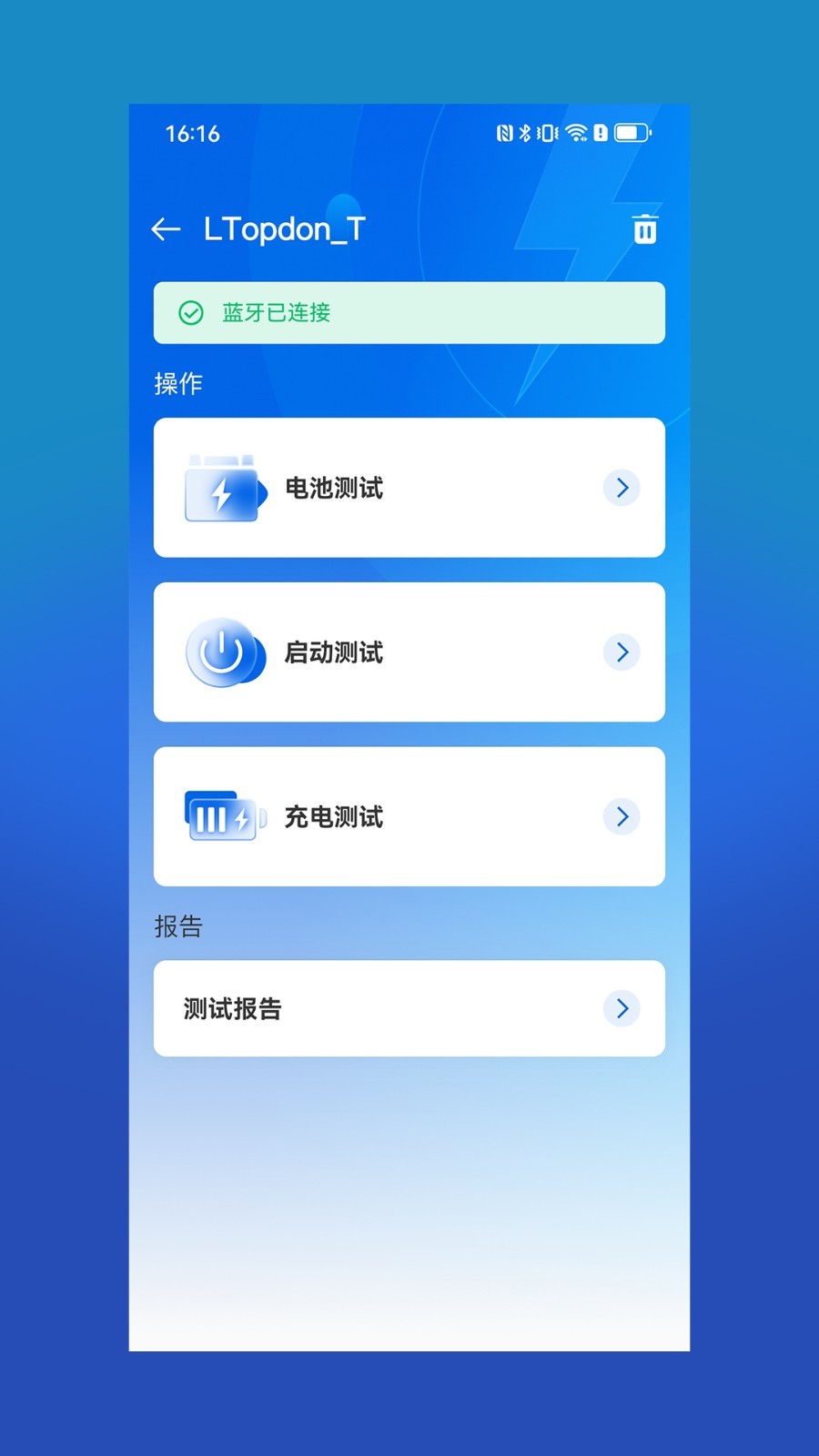 本APP为鼎匠电池检测系列产品专用。把电池检测仪设备通过蓝牙连接本APP,为12V的汽车蓄电池进行检测。 提供以下功能: 1、12V汽车蓄电池寿命检测、电压检测、内阻检测等。 2、12V汽车启动测试、充电测试。 3、电池检测报告和分享功能。