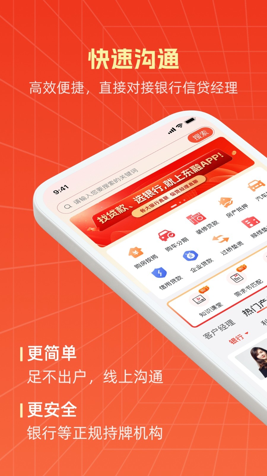 找贷款、选银行,就上东融APP!直联百家银行,直聊信贷经理,比产品、比价格、比服务,货比三家,一站式全搞定!