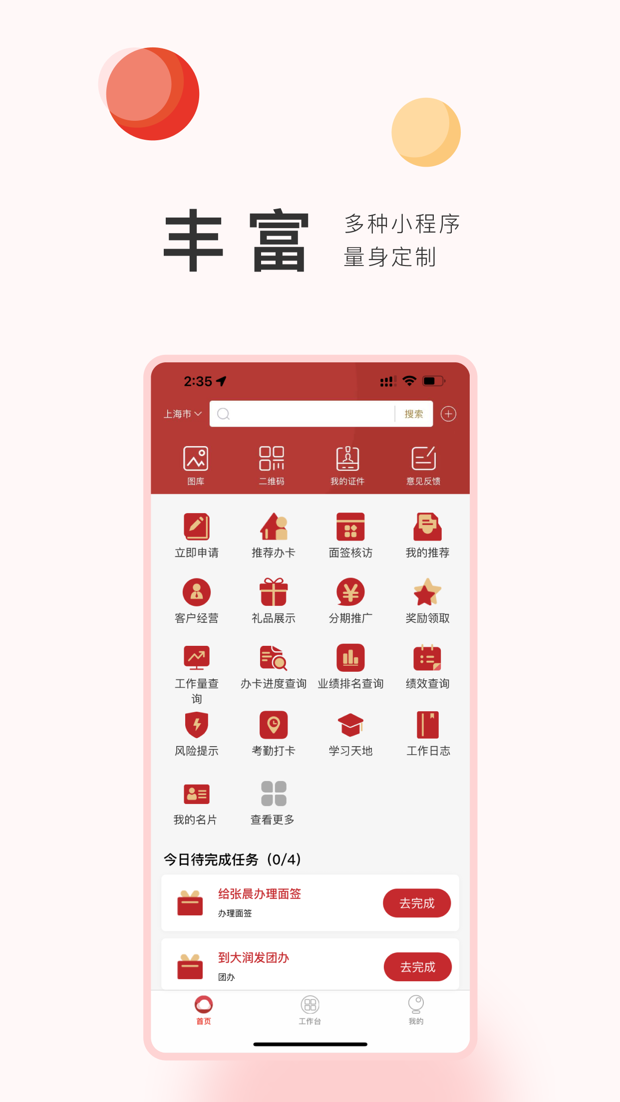 产品功能主要有:移动营销、用户管理、数据查询、学习园地、资质认证与展示等。 本产品不开通自助注册功能,仅为银行白名单用户提供服务。