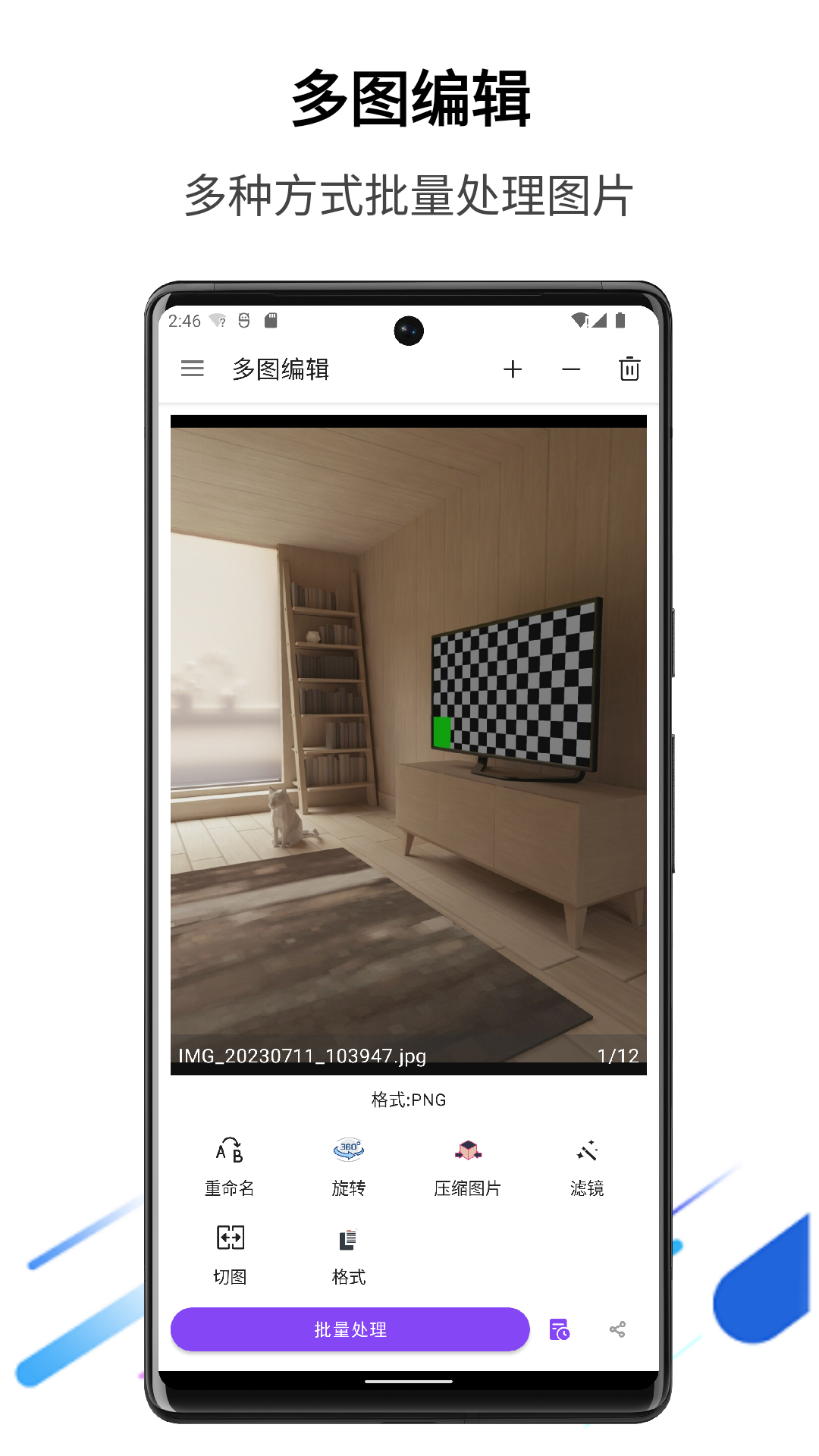 应用详情:方便用户实现批量图片的压缩、重命名、旋转、滤镜、切图、保存格式等操作。