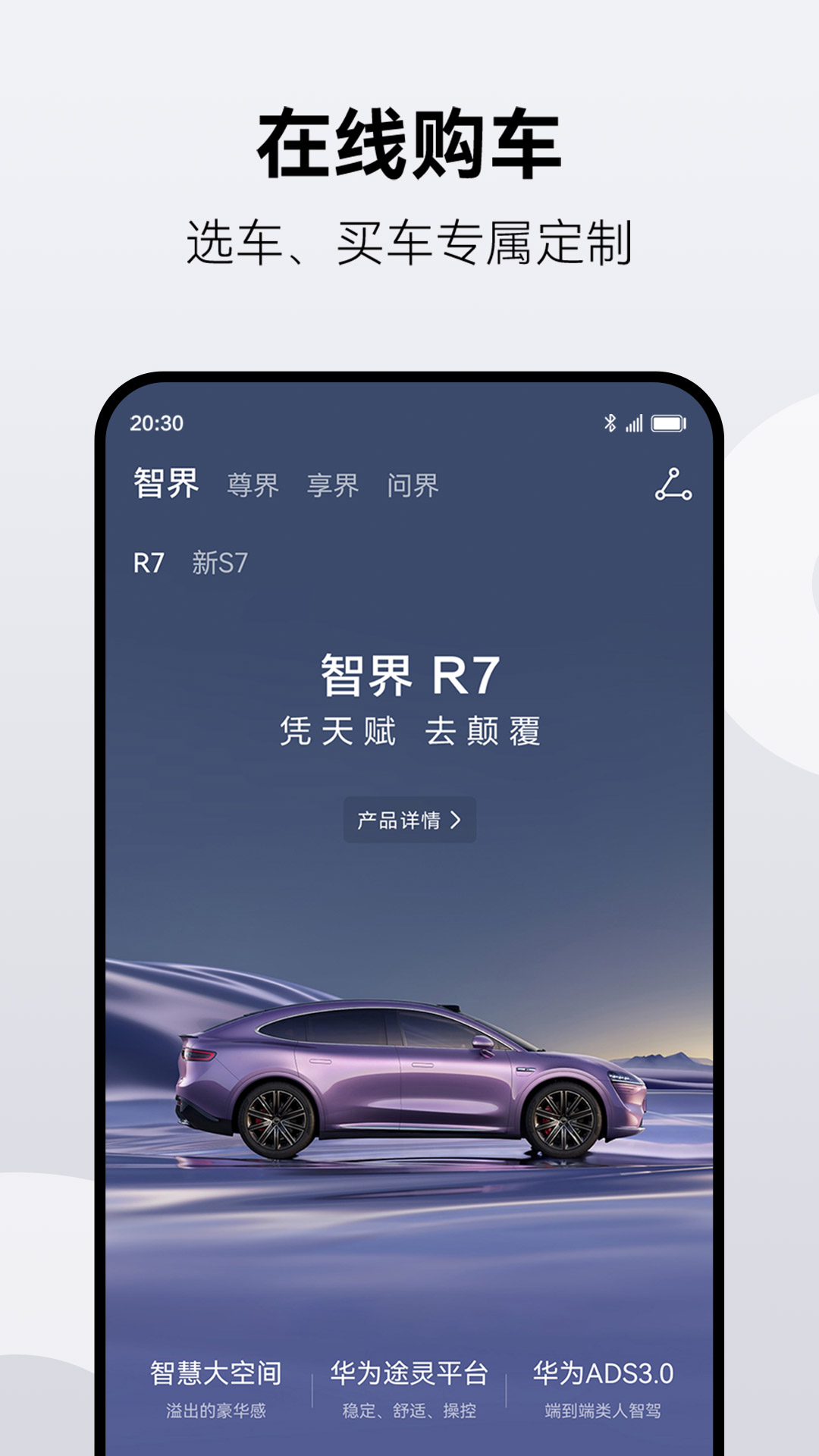 是华为智选车业务的全新升级,旗下目前已拥有问界、智界、享界、尊界等系列车型。App是官方平台,汇集了官方资讯、订车购车、智能车控、充电服务、精选等内容,帮助更多人全方位了解,实时解锁新车体验。
