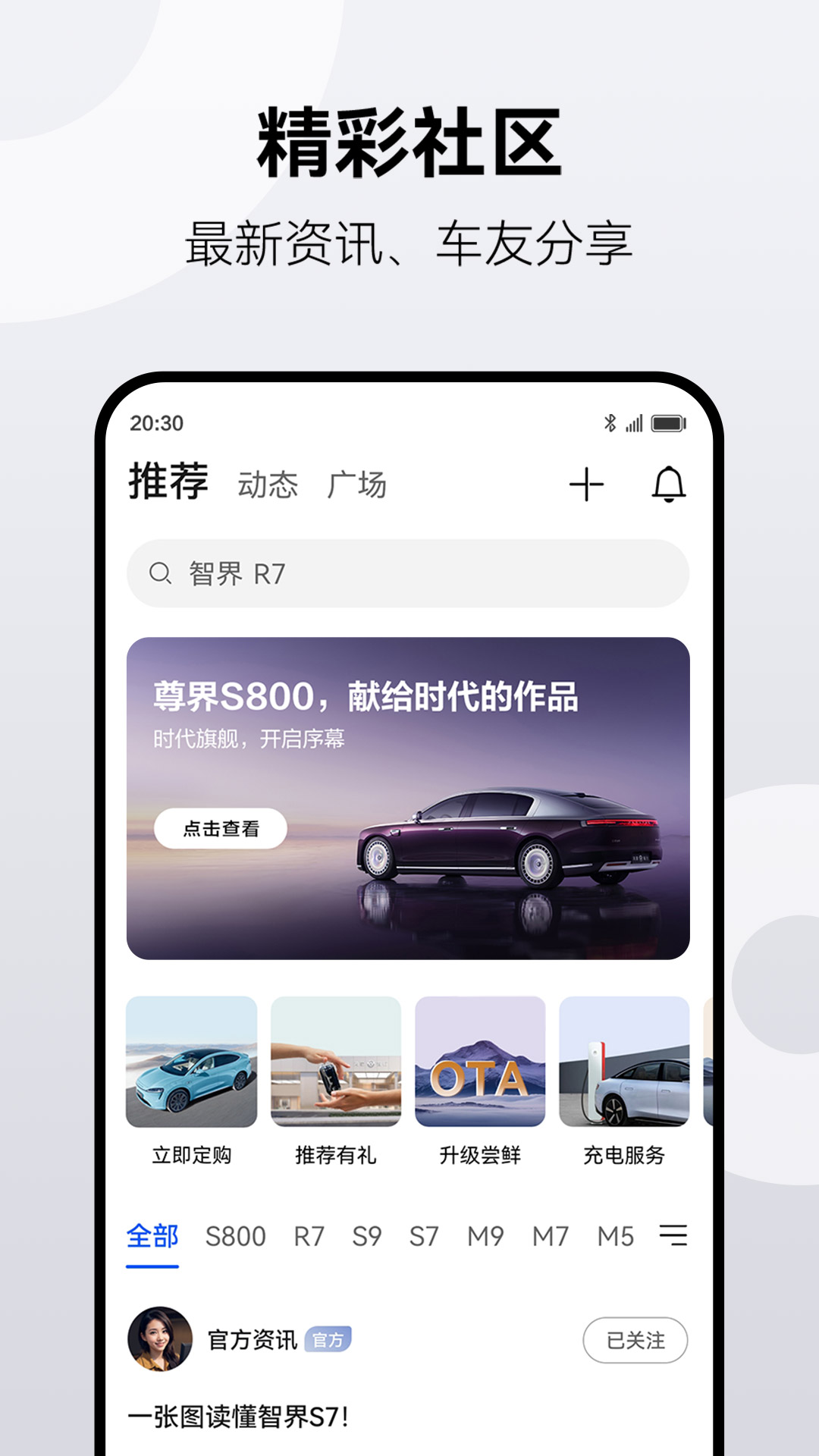 应用详情:安装 APP 最新版,M8、M9、S800资讯一手掌握,预订即享购车权益。