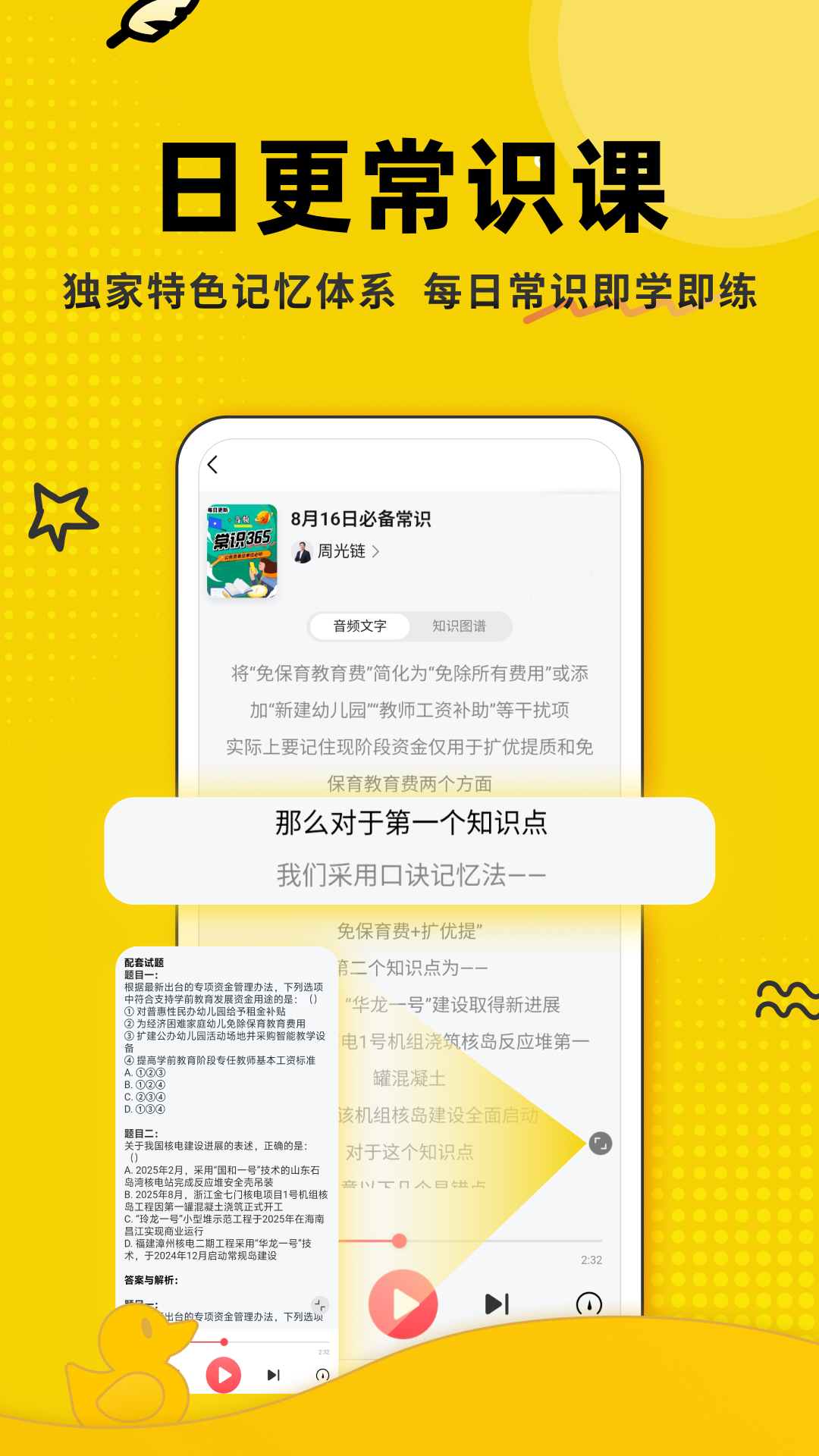 应用详情:上岸鸭公考APP是一个公职教育在线学习平台,专注为学员提供包括公务员、事业单位、教资教招、文职、央国企、银行、社工在内的招录考试培训。拥有上千人教学研发团队,深度研究不同区域的特色考情和命题趋势,倾力打造“线上线下,全场景,全阶段”的备考模式。“上岸鸭””,寓意着我们对每一位学员的美好期望。选择“上岸鸭”,就是选择了一个与你共同成长的伙伴。懂公考,更懂你!