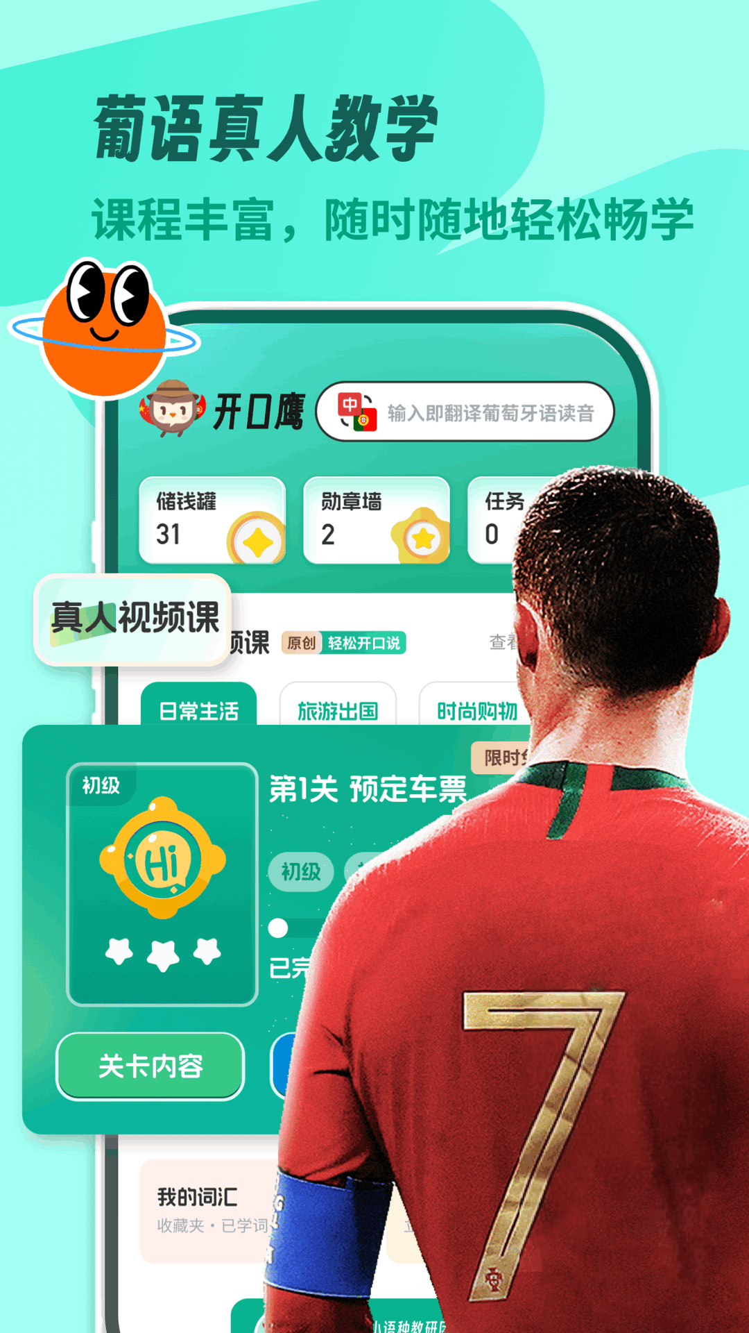 应用详情:开口鹰葡萄牙语学习,集合丰富的葡语单词词汇,地道葡萄牙真人发音,沉浸式葡萄牙语场景教学,葡萄牙语发音知识点,助您轻松学葡语。