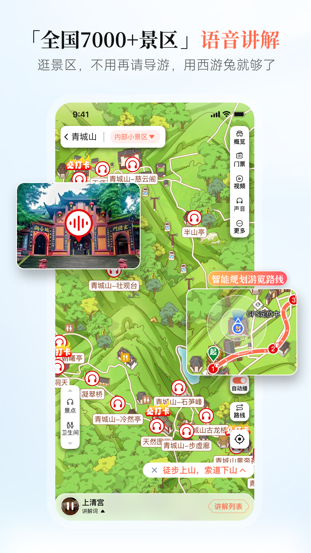 「智能导览 + 实时定位」踏青赏花覆盖全球 7000 + 热门景区精准 GPS 实时定位,樱花景区讲解、桃花岛智能导览、油菜花田语音讲解、春季赏花路线规划,边走边播详尽语音讲解,专业导游倾心打磨内容,搭配精美导览地图,景区导航一键直达,告别走马观花,沉浸式感受景点魅力,设施精准标记卫生间、售票处、出入口、行走路线规划,解决迷路导致的所有问题。