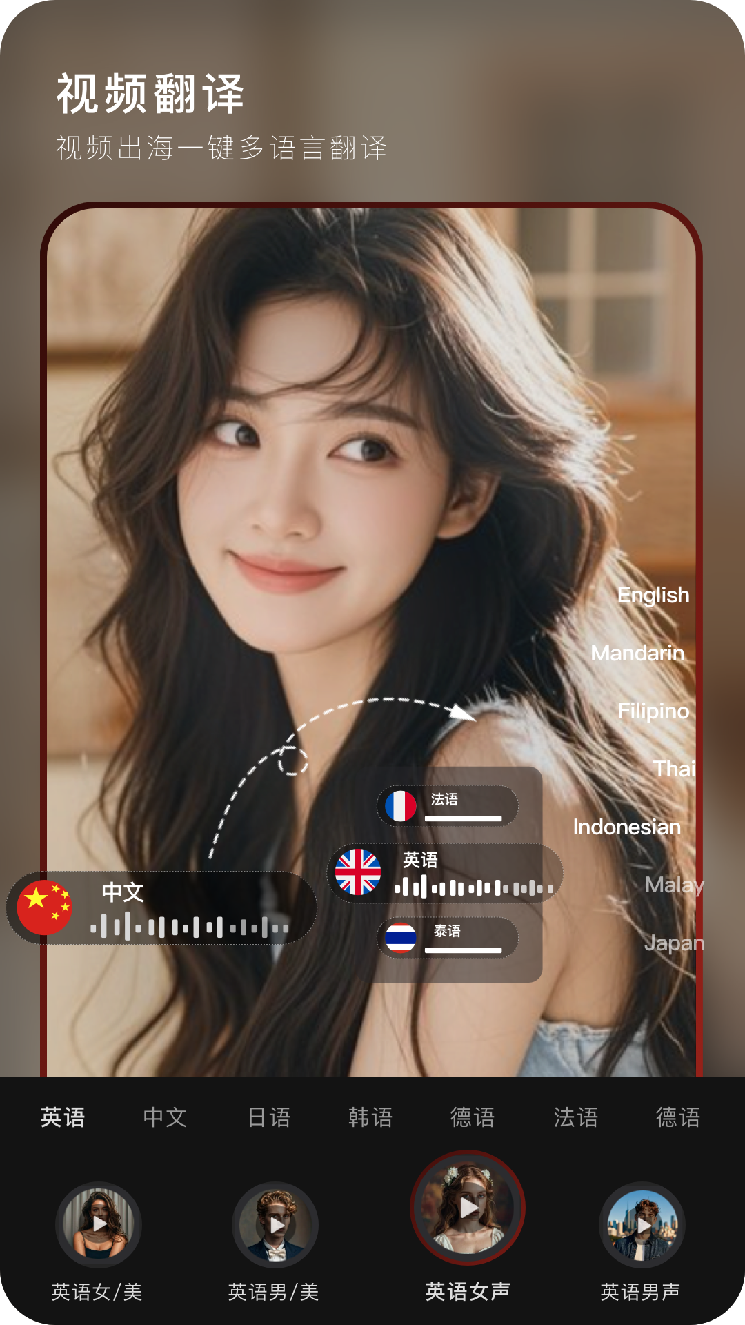 视频翻译:针对短视频出海,一键翻译准确率高达98%,语音自然流畅,声音画面高度同步,支持生成各种样式字幕。