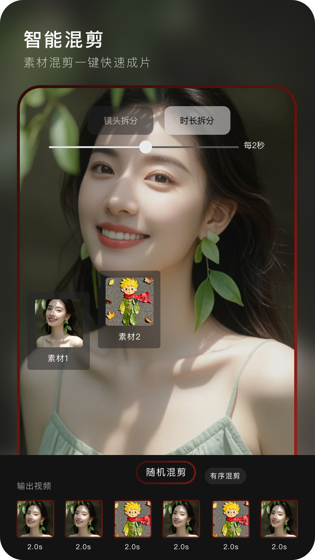 【智能混剪功能】 复刻爆款视频的音频和节奏,一键智能拆分视频素材镜头,重新混剪生成一条全新的爆款视频。