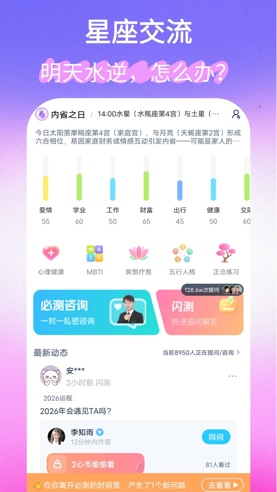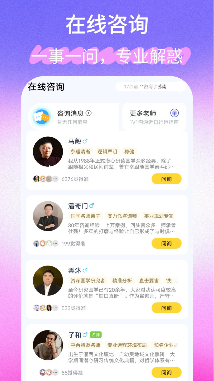 闪测功能,无需等待与预约,即刻倾诉,即时疏通。我们精心准备了海量热门咨询题库,涵盖您可能关心的方方面面。无论是关于婚姻、爱情、职业还是潜能发掘的问题,