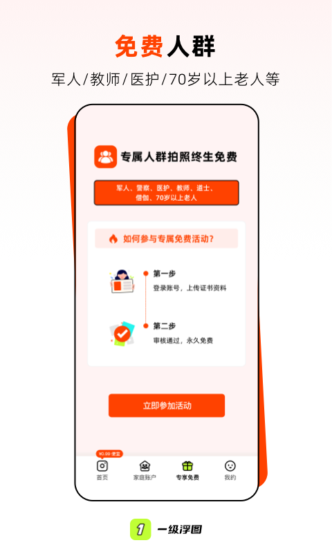 一级浮图针对军人、教师、医护、70岁以上老人等人群0元开放!所有电子证件照功能终身0元,证件照制作0元拍!后续活动人群扩展中,敬请期待!