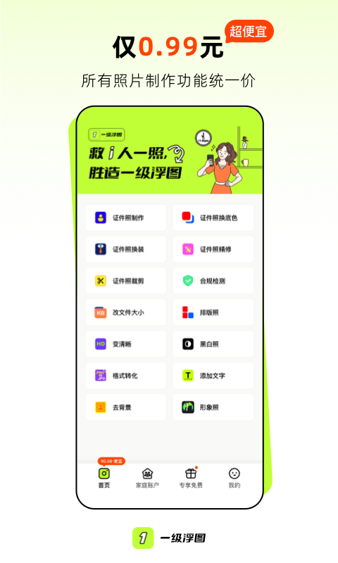 仅0.99!仅0.99元!超便宜证件照制作!高清证件照、证件照美颜、证件照换服装、证件照换底色、证件照改尺寸…所有照片制作功能统一价,仅需0.99!仅需0.99!没有套路,纯属便宜,制作效果堪比相馆!