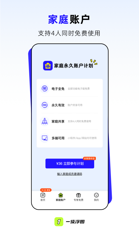 与家人共享,一级浮图开创证件照制作新模式!家庭模式可同时支持4人0元使用,不限时间和次数,可邀请家人、朋友、同学等加入家庭共享账户,一次支付,仅需36元!不限次数不限时间!更实惠!