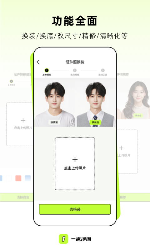 一级浮图包含证件照制作、证件照换装、证件照改尺寸大小、证件照合规性检测、证件照改kb、证件照裁剪、照片格式转换、证件照美颜精修、黑白照、排版照、证件照抠图去背景等功能,囊括证件照片全场景需求,一键操作,方便快捷!同时包含600+证件照规格,包含日常一寸、二寸照等,红白蓝等底色,还包含公务员考试规格、教资考试报名规格、英语四六级、计算机等级考试等专业技能考试规格,以及专升本、自考等学历考试规格……同时支持自定义规格,更全更快更方便!