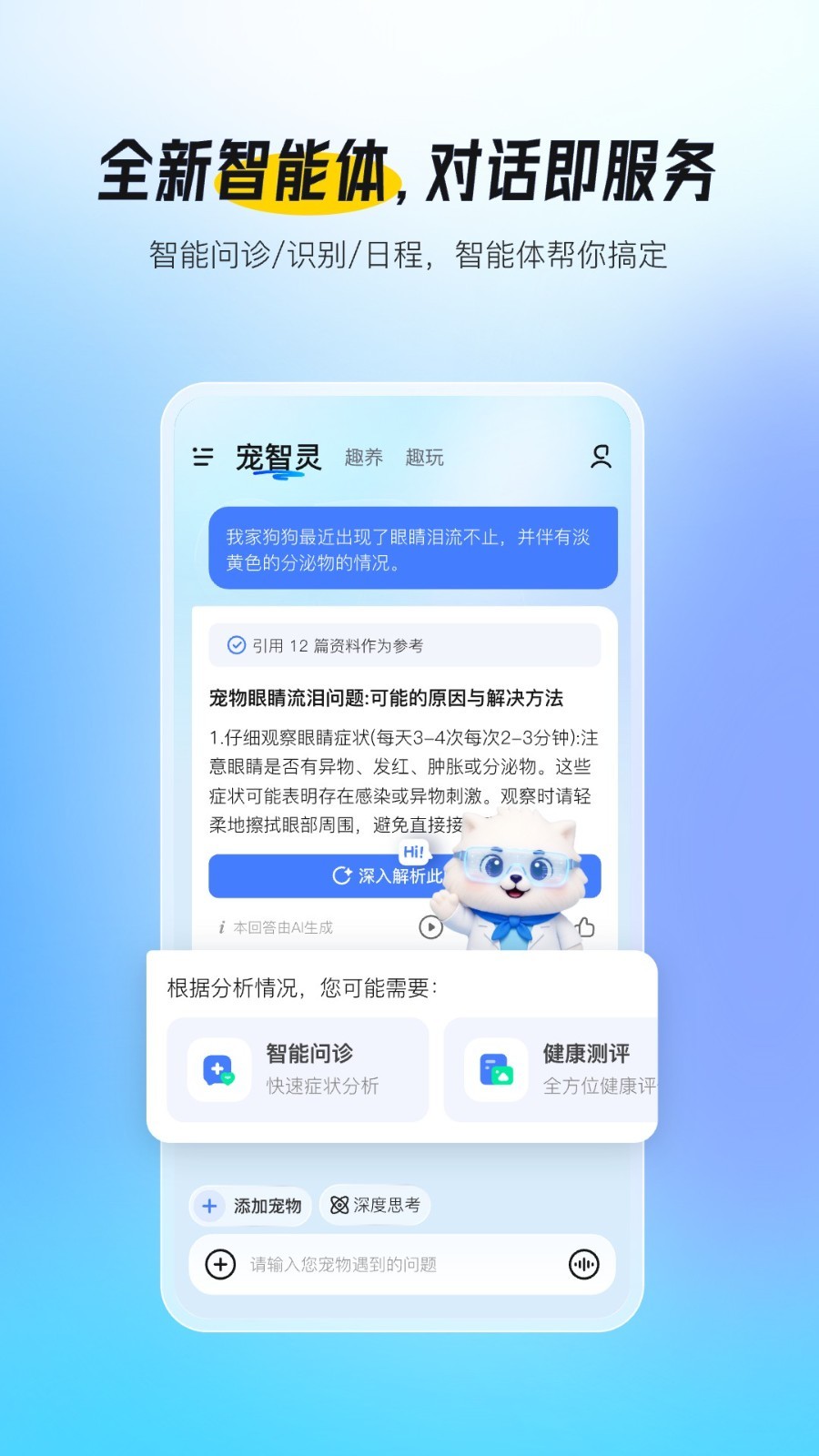 AI智能问诊:爱宠突发不适?随时在线咨询,获得专业分析和护理指导,从容应对。