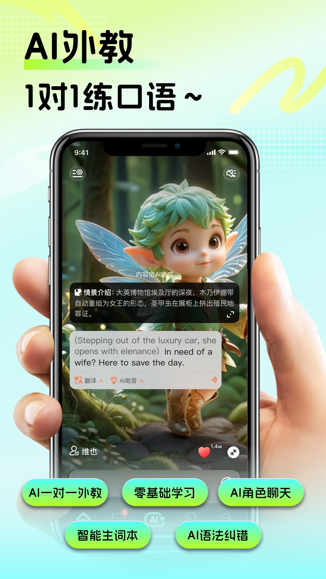 AI情景对话:模拟真人外教1对1陪练,实时反馈发音得分,针对性纠正连读、爆破音等发音难点,学习更高效。