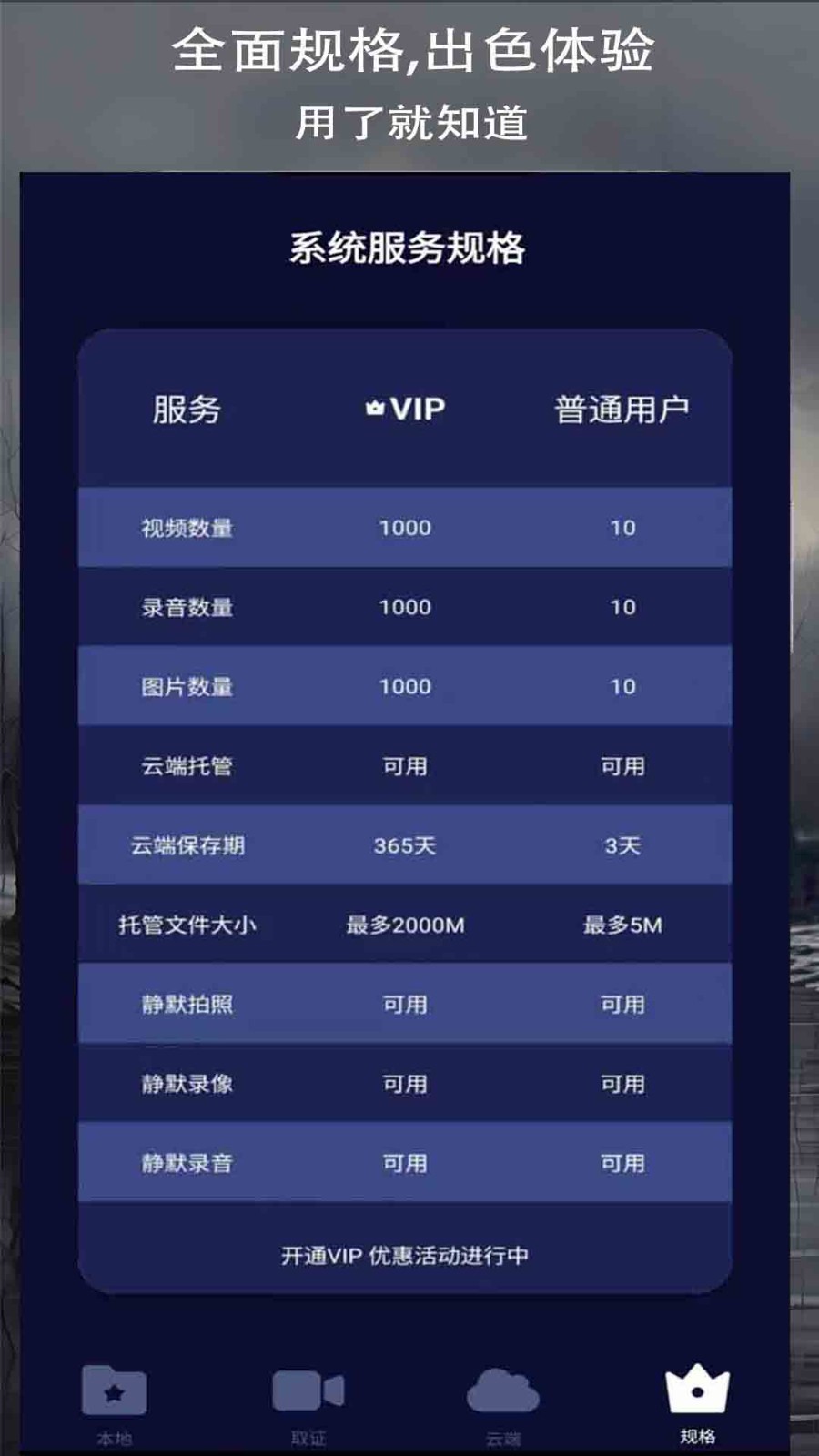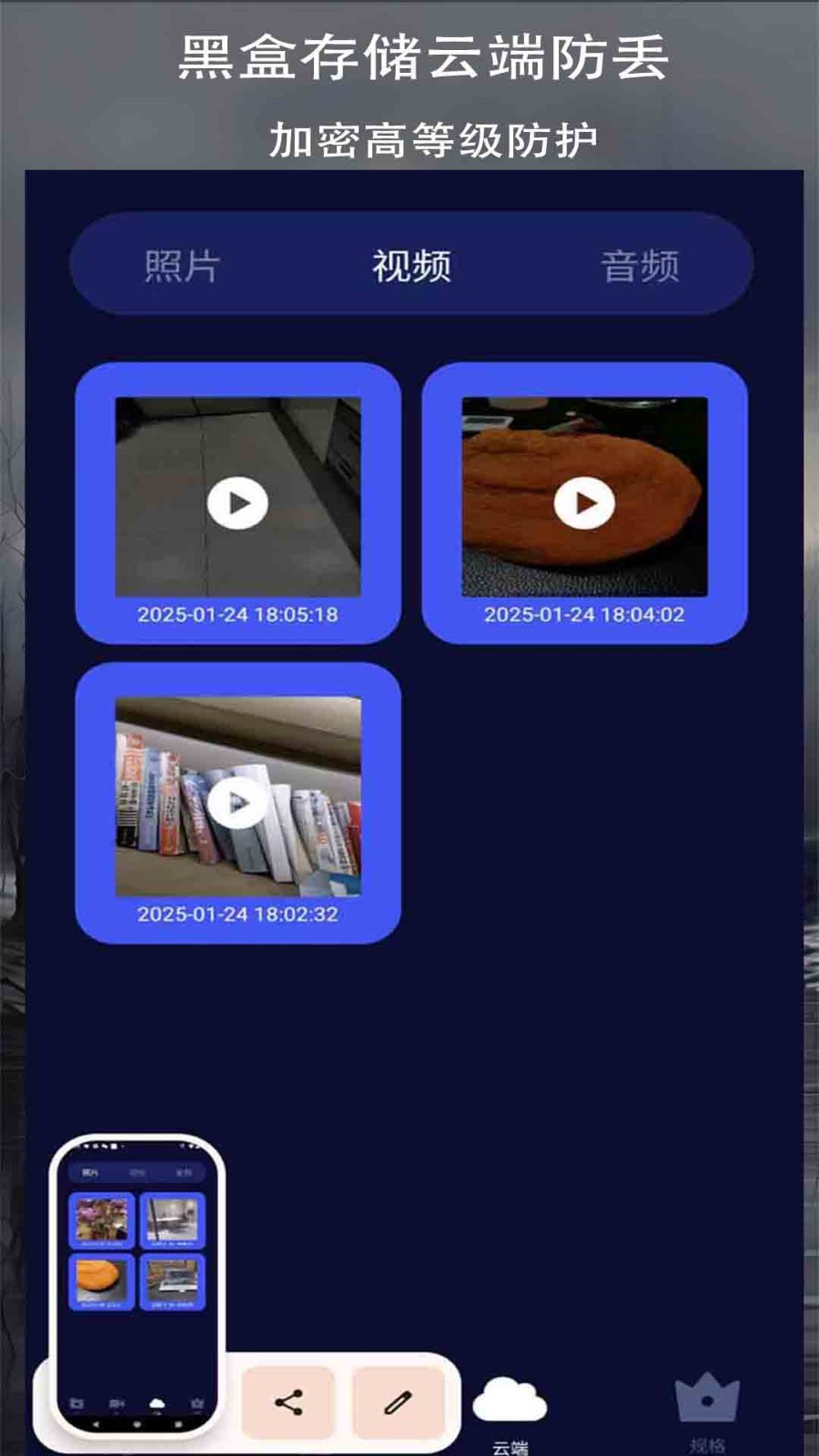 本软件旨在帮助受过伤害的人,或者作为律师工具。 实现无息录像、录音和定时拍照,用于保护取证者的安全性。 文件本地存储,也可云端托管,数据黑盒存储确保安全。 功能包括: 1、为取证命名,和文件浏览查询 2、设置取证屏幕外观,黑屏、其他或者自定义 3、定时拍照、无息录像、无息录音 4、本地证据文件管理,浏览、删除 、云端托管 6、云端文件管理,删除、下载和其他 6、分享、意见反馈等