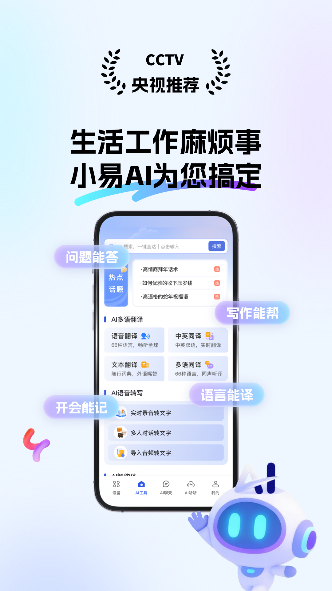 生活工作麻烦事,用小易AI就能搞定!速速下载,一起开启AI新技能! 【小易AI核心功能】 ●录音实时转文字:开会、谈话时打开它,自动生成文字稿,智能摘要一键出,再也不用手写笔记和会议纪要啦! ●多国语言翻译:遇到外语看不懂?说话就能翻译,出国旅游、跨国开会没问题! ●AI帮你写东西:写工作总结、朋友圈文案、作文不用愁,告诉小易你的想法,一篇好文马上有。 ●AI有问必答:遇到任何问题,随时问小易,它就像个无所不知的智能老师,为你解答。 ●猫语翻译神器 :主子叫啥全听懂,是饿了还是想玩?小易AI帮你翻译,养猫更轻松! ●克隆你的声音:录制10秒,秒变你的专属AI语音包,播报、讲故事都用你的声音! 【小易AI技术服务】 ●可连接多种设备,AI体验加倍提升 ●高精度AI语音识别与翻译技术 ●自研声学AI模型,嘈杂环境也清晰 简单,好用,一学就会——小易AI,就是你口袋里的全能小助手