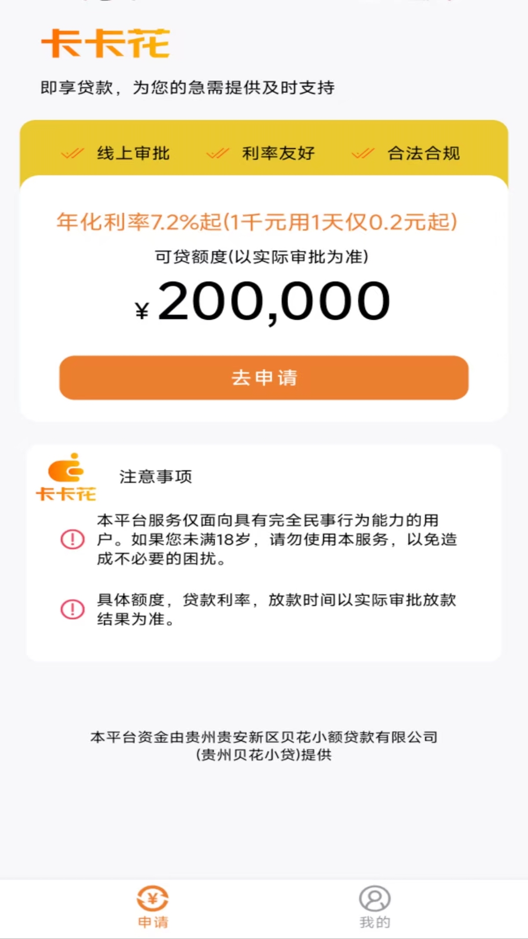 生活中,资金周转难题总是不期而至, 卡卡花APP它是一款专为现代用户量身打造的线上贷款服务平台,以专业、便捷、安全的服务,打破传统贷款的繁琐与不便,为用户开启灵活的资金获取新体验: 点击按钮-填写信息-提交申请-完成申请-等待结果 只需要线上五步简单操作 且采用加密技术保护用户信息,确保每一位用户都能享受到合法合规、安全可靠的贷款服务。 机构服务:河北凌迈融资担保有限公司 资方服务:贵州贵安新区贝花小额贷款有限公司 注:产品仅作为引流平台,经营范围为贵阳市。
