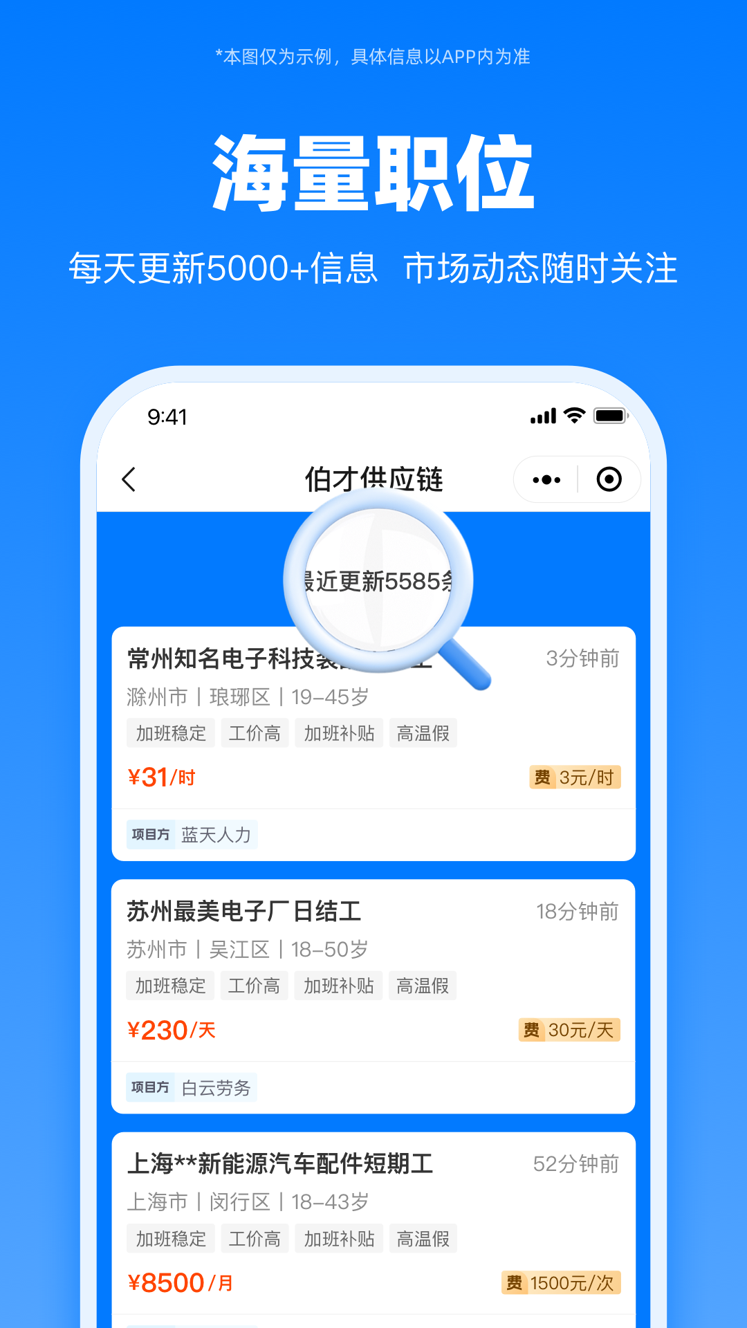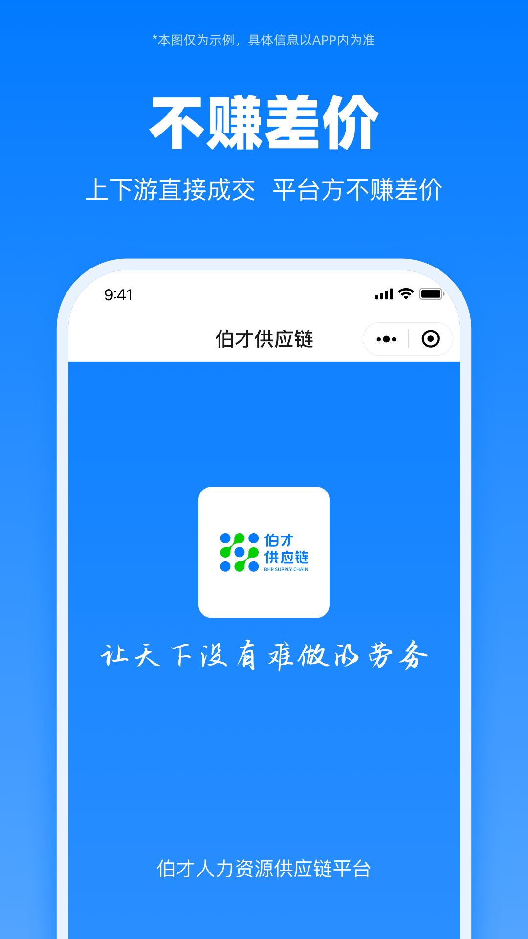 伯才供应链——劳务人必备APP。 伯才供应链是一个专门为劳务同业伙伴打造的综合服务系统,致力于实现 “让天下没有难做的劳务” 的使命。 系统每日实时更新 5000+条用工需求信息,用户可通过手机随时随地查看市场行情与政策变动。 伯才供应链系统不赚差价,上游发单价格即下游所见价格,平进平出。同时,系统具备快速报名、智能匹配、工单跟踪、财务结算等实用功能,还为上游提供多渠道的流量分发服务。