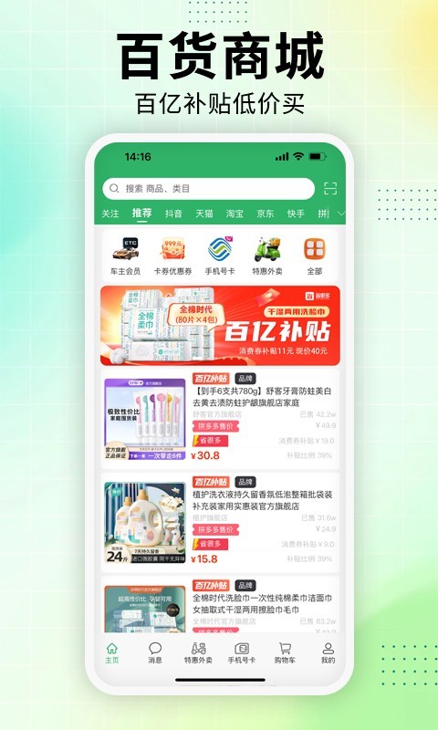 3.百亿补贴:集淘宝、天猫、京东、拼多多、抖音、快手超6000W+底价商品,汇集数万知名品牌,百万靠谱商家,千万补贴商品,越买越省钱。