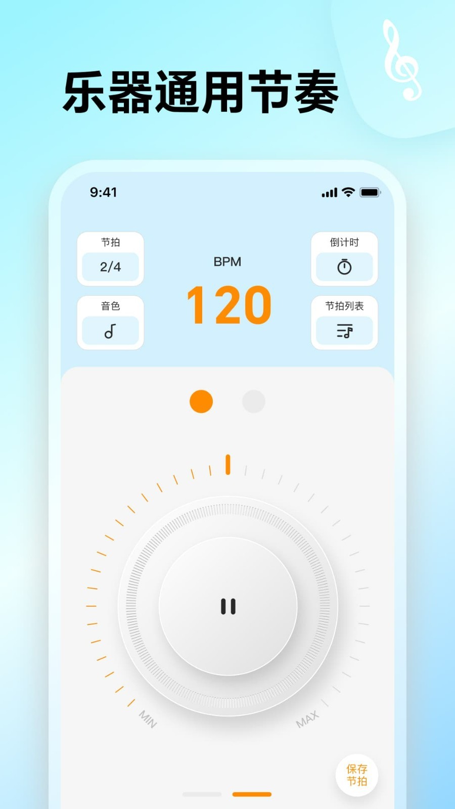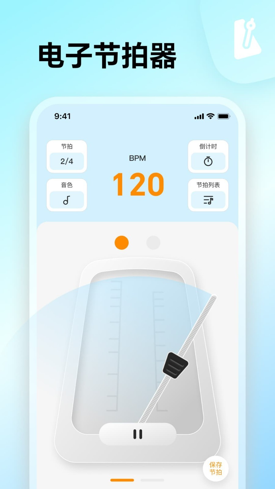 - 滑轮式控制节拍频率: - 支持多种不同的音色; - 多种不同节奏供选择; - 调节各种节奏的速率直至调出所需音乐节拍; - 你拥有的手机节拍器,按钮点一点,操作方便快捷; - 简单精美而又充满人性化的操作界面; - 更多的功能期待您的亲自体验。
