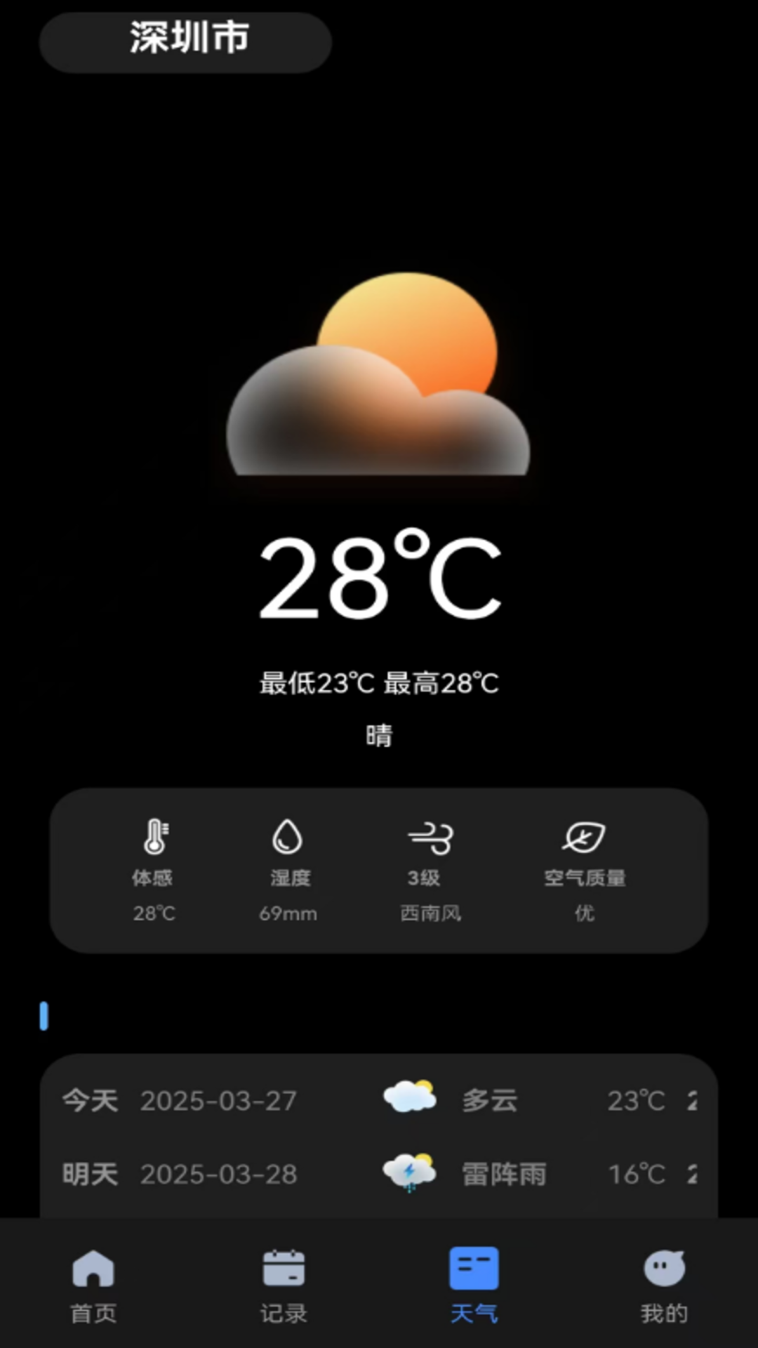 应用详情:该应用展示了一个多功能应用程序的界面,主要包括以下内容:深圳的天气信息,包...