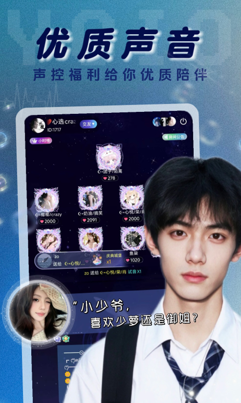邂逅让你心动的专属声线!御姐、萝莉、少年、青叔等全类型声音一键邂逅,搭配试音卡真人试麦功能,沉浸式体验真实声线,解锁属于你的小确幸,开启趣味连麦新体验~