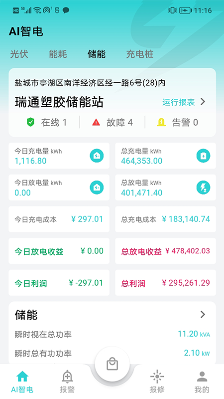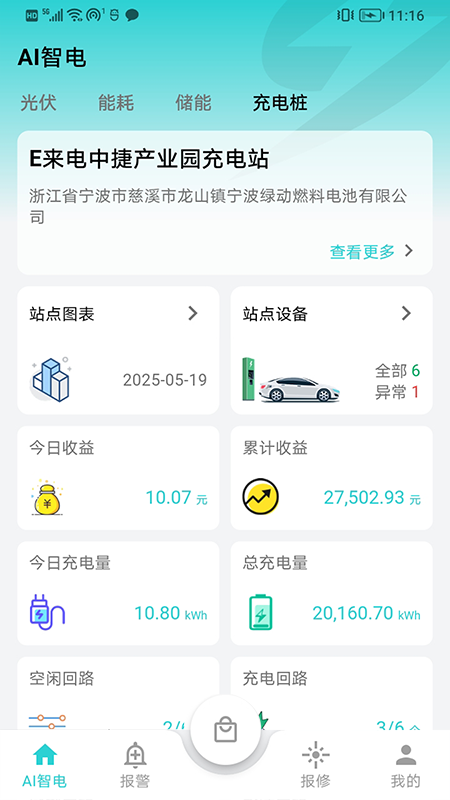 应用详情:该应用主要用于监测公司的光储充项目。其主要功能包括:展示光伏电站运行状态和收益统计,储能站点的运行状态监测和收益统计,充电桩站点的运行状态及收益统计。