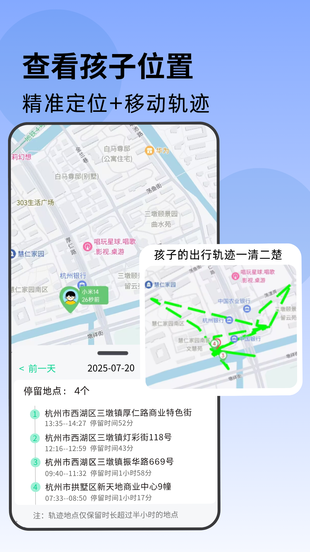 4、实时定位:实时获取孩子位置信息、历史轨迹查询,保障孩子出行安全,让家长安心放心。