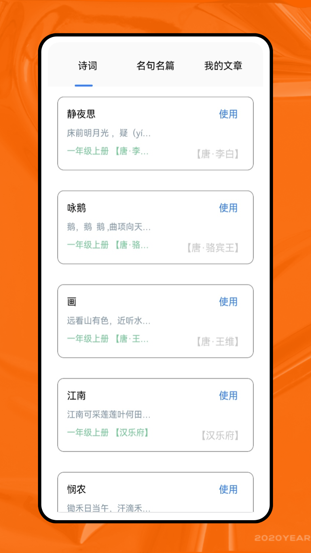 一款专为语文学习者打造的综合性学习APP,旨在通过丰富多样的学习资源和有趣高效的学习方式,帮助用户提升语文素养,涵盖从古诗词积累到课外阅读拓展,从基础字词学习到写作能力提升等多方面内容,适用于学生群体巩固课堂知识,也适合语文爱好者进行自我提升 。海量诗词库:首页设有唐诗、宋词、楚辞、诗经、乐府等分类板块,涵盖各个朝代、各种风格的经典诗词 。课外阅读资源:“打卡”页面的“课外阅读”栏目提供丰富的课外读物,涵盖不同体裁和主题,如文学名著、科普文章等,培养用户阅读习惯,提升阅读理解能力 。习惯打卡:用户可在“打卡”页面设置语文学习打卡任务,如每日背诵古诗词、阅读一篇文章等,记录学习轨迹,养成持续学习的好习惯,无论你是想要提高语文成绩的学生,还是热爱中国传统文化的爱好者,APP 都能成为你探索语文的得力助手,快来下载体验,开启丰富多彩的语文学习之旅吧!